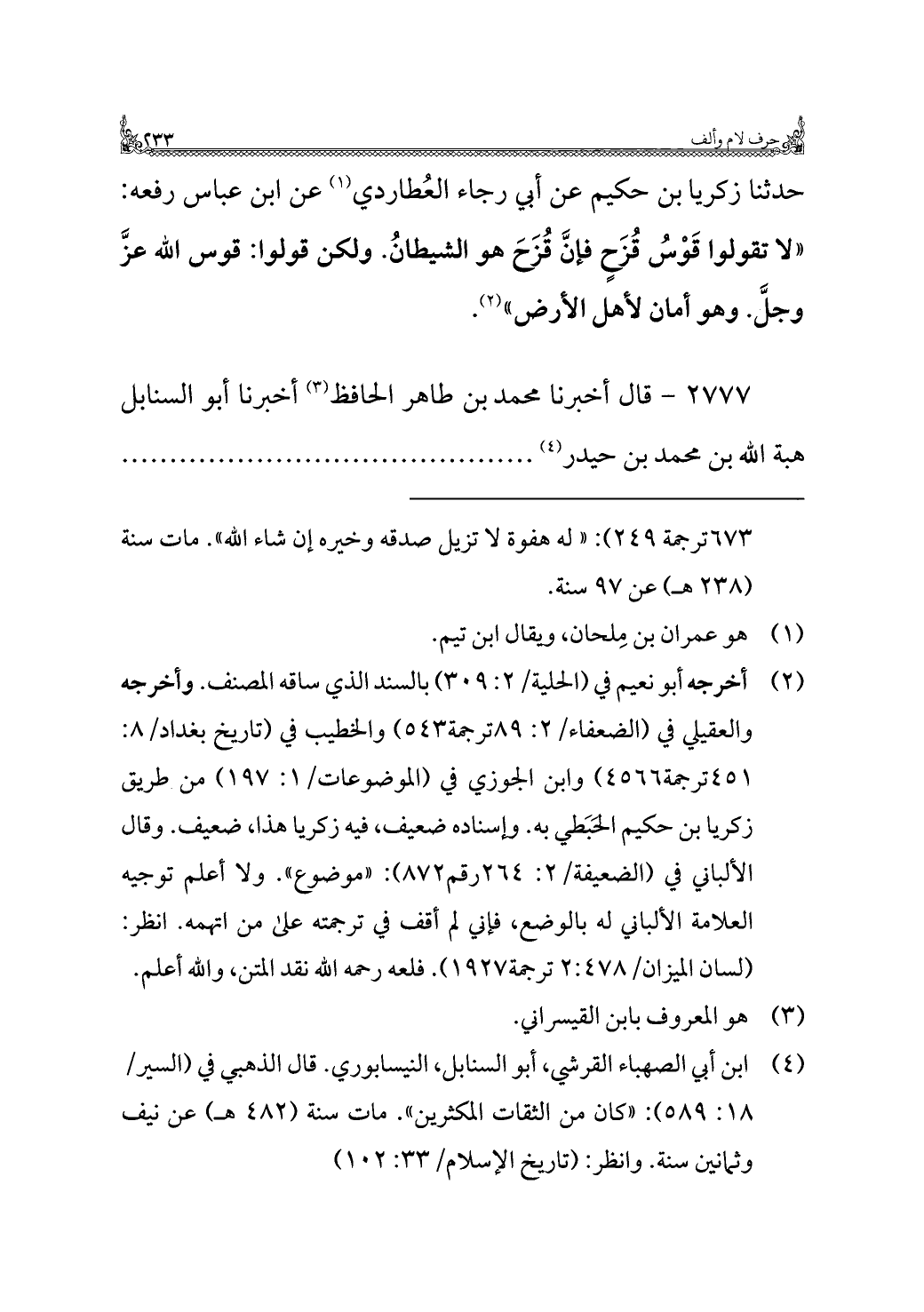 حدثنا زكريا بن حكيم عن أبي رجاء العُطاردي (¬١) عن ابن عباس رفعه: "لا تقولوا قَوْسُ قُزَحٍ فإنَّ قُزَحَ هو الشيطانُ. ولكن قولوا: قوس الله عزَّ وجلَّ. وهو أمان لأهل الأرض" (¬٢).