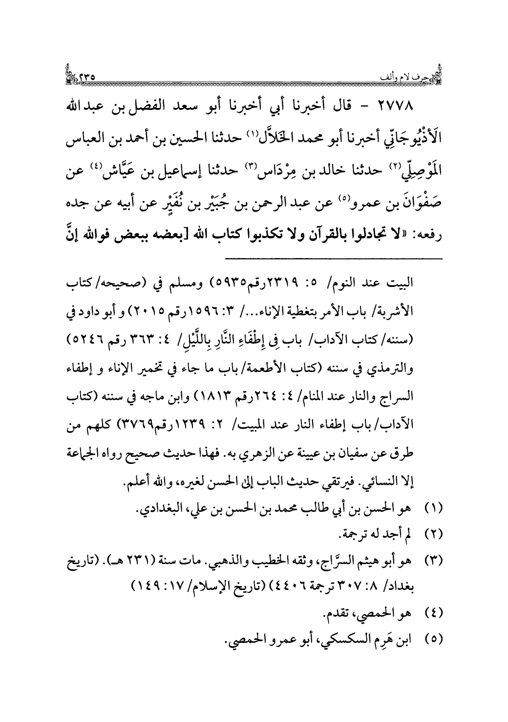 ٢٧٧٨ - قال أخبرنا أبي أخبرنا أبو سعد الفضل بن عبد الله الَأذْيُوجَانِّي أخبرنا أبو محمد الجلَّال (¬١) حدثنا الحسين بن أحمد بن العباس المَوْصِلّي (¬٢) حدثنا خالد بن مِرْدَاس (¬٣) حدثنا إسماعيل بن عَيَّاش (¬٤) عن صَفْوَانَ بن عمرو (¬٥) عن عبد الرحمن بن جُبَيْر بن نُفَيرٍ عن أبيه عن جده رفعه: "لا تجادلوا بالقرآن ولا تكذبوا كتاب الله [بعضه ببعض فوالله إنَّ