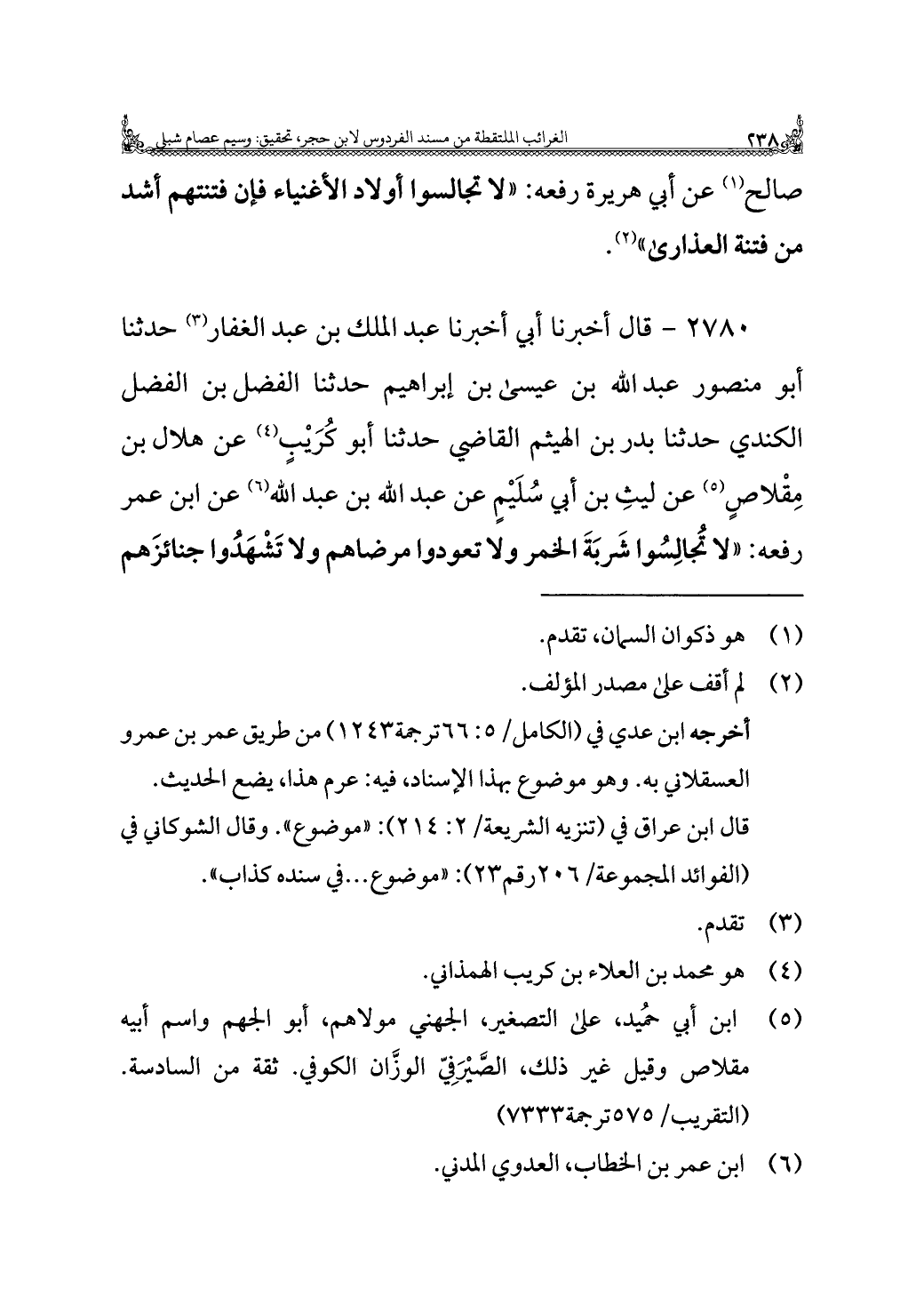 ٢٧٨٠ - قال أخبرنا أبي أخبرنا عبد الملك بن عبد الغفار (¬٣) حدثنا أبو منصور عبد الله بن عيسى بن إبراهيم حدثنا الفضل بن الفضل الكندي حدثنا بدر بن الهيثم القاضي حدثنا أبو كُرَيْبٍ (¬٤) عن هلال بن مِقْلاصٍ (¬٥) عن ليثِ بن أبي سُلَيْمٍ عن عبد الله بن عبد الله (¬٦) عن ابن عمر رفعه: "لا تُجالِسُوا شَربَةَ الخمر ولا تعودوا مرضاهم ولا تَشْهَدُوا جنائزَهم