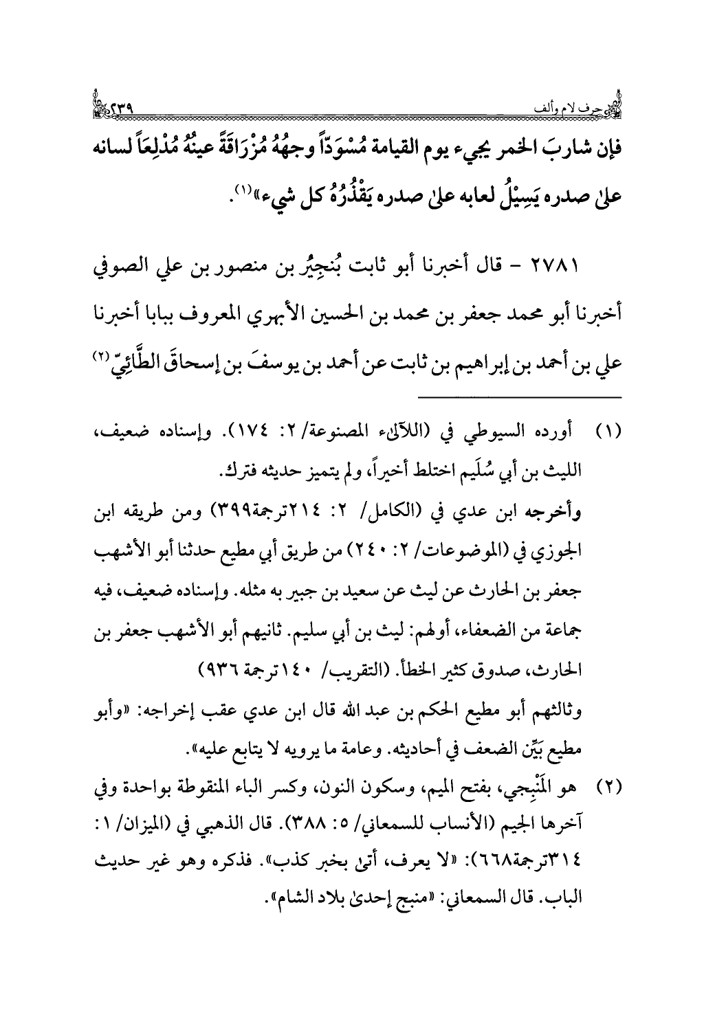 (¬٢) هو المَنْبِجي، بفتح الميم، وسكون النون، وكسر الباء المنقوطة بواحدة وفي آخرها الجيم (الأنساب للسمعاني/ ٥: ٣٨٨). قال الذهبي في (الميزان/ ١: ٣١٤ ترجمة ٦٦٨): "لا يعرف، أتى بخبر كذب". فذكره وهو غير حديث الباب. قال السمعاني: "منبج إحدى بلاد الشام".