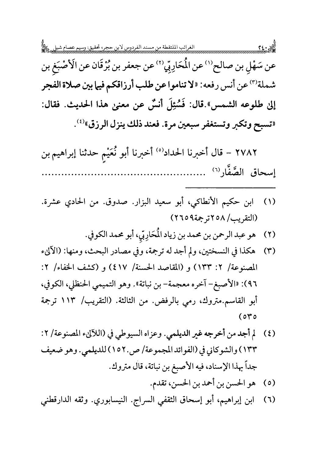 عن سَهْلِ بن صالح (١) عن المُحَارِبِّي (¬٢) عن جعفر بن بُرْقَان عن الَأصْبَغِ بن شملة (¬٣) عن أنس رفعه: "لا تناموا عن طلب أرزاقكم فيما بين صلاة الفجر إلى طلوعه الشمس". قال: فَسُئِلَ أنسٌ عن معنى هذا الحديث. فقال: (تسبح وتكبير وتستغفر سبعين مرة. فعند ذلك ينزل الرزق" (¬٤).