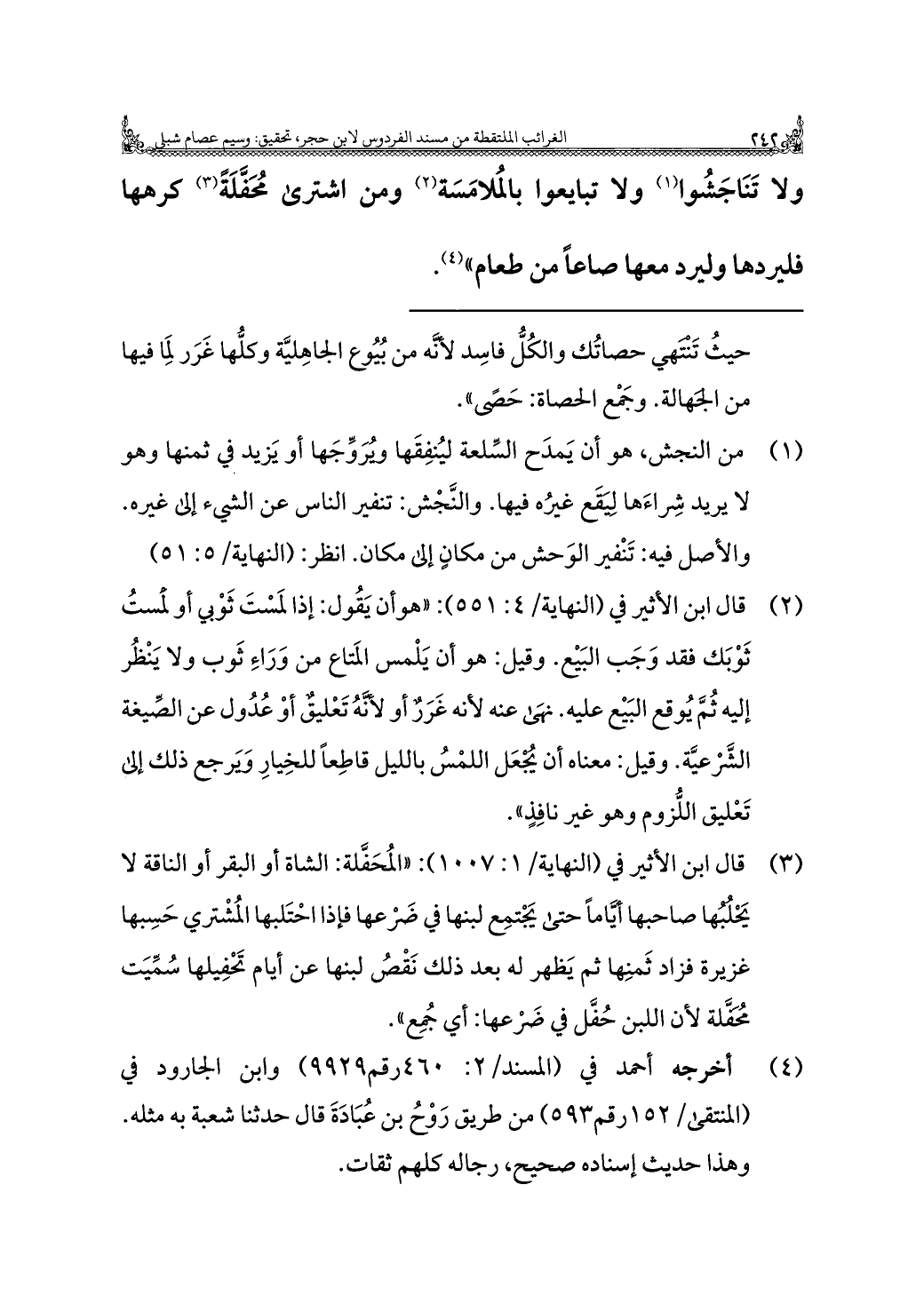 ولا تَنَاجَشُوا (¬١) ولا تبايعوا بالمُلامَسَة (¬٢) ومن اشترى مُحَفَّلَةً (¬٣) كرهها فليردها وليرد معها صاعًا من طعام" (¬٤).