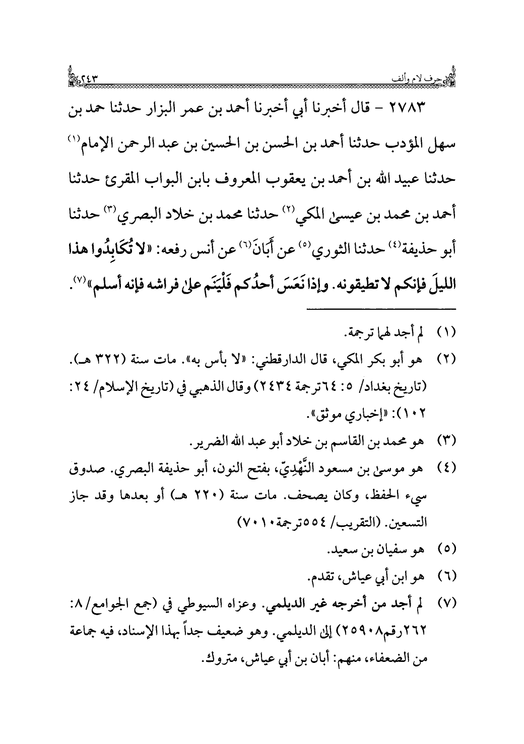 ٢٧٨٣ - قال أخبرنا أبي أخبرنا أحمد بن عمر البزار حدثنا حمد بن سهل المؤدب حدثنا أحمد بن الحسن بن الحسين بن عبد الرحمن الإمام (¬١) حدثنا عبيد الله بن أحمد بن يعقوب المعروف بابن البواب المقرئ حدثنا أحمد بن محمد بن عيسى المكي (¬٢) حدثنا محمد بن خلاد البصري (¬٣) حدثنا أبو حذيفة (¬٤) حدثنا الثوري (¬٥) عن أَبَانَ (¬٦) عن أنس رفعه: "لا تكابِدُوا هذا الليلَ فإنكم لا تطيقونه. وإذا نَعَسَ أحدُكم فَلْيَنَم على فراشه فإنه أسلم" (¬٧).