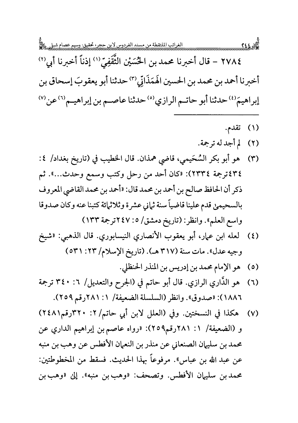٢٧٨٤ - قال أخبرنا محمد بن الحُسَيْن الثّقفِيّ (¬١) إذنًا أخبرنا أبي (¬٢) أخبرنا أحمد بن محمد بن الحسين الَهمَذَانِّي (¬٣) حدثنا أبو يعقوبَ إسحاق بن إبراهيمَ (¬٤) حدثنا أبو حاتم الرازي (¬٥) حدثنا عاصم بن إبراهيم (¬٦) عن (¬٧)