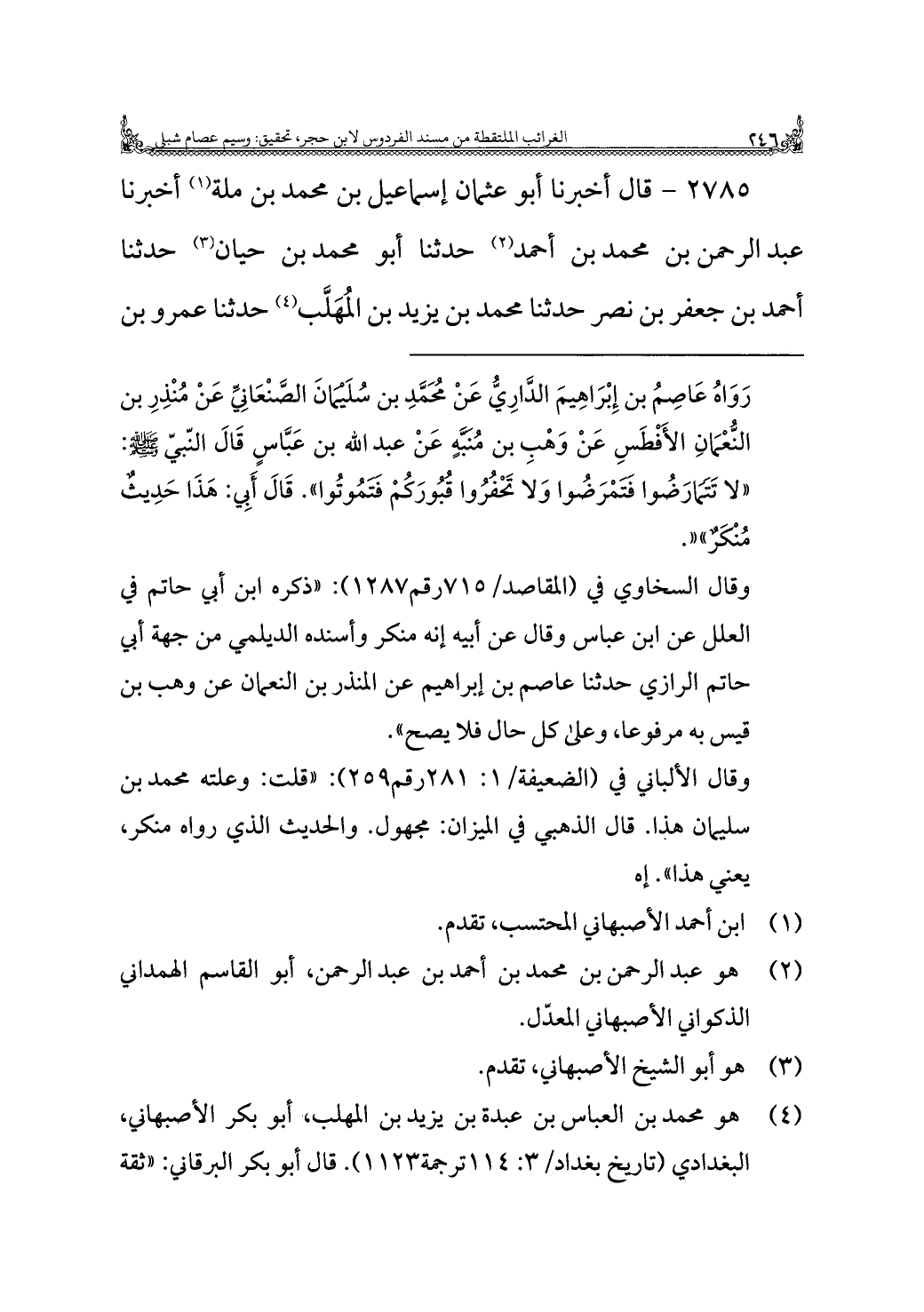 ٢٧٨٥ - قال أخبرنا أبو عثمان إسماعيل بن محمد بن ملة (¬١) أخبرنا عبد الرحمن بن محمد بن أحمد (¬٢) حدثنا أبو محمد بن حيان (¬٣) حدثنا بن جعفر بن نصر حدثنا محمد بن يزيد بن المُهَلَّب (¬٤) حدثنا عمرو بن