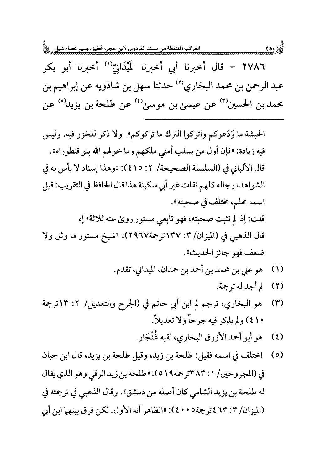 ٢٧٨٦ - قال أخبرنا أبي أخبرنا المَيْدَانِيّ (¬١) أخبرنا أبو بكر عبد الرحمن بن محمد البخاري (¬٢) حدثنا سهل بن شاذويه عن إبراهيم بن محمد بن الحسين (¬٣) عن عيسى بن موسى (¬٤) عن طلحة بن يزيد (¬٥) عن