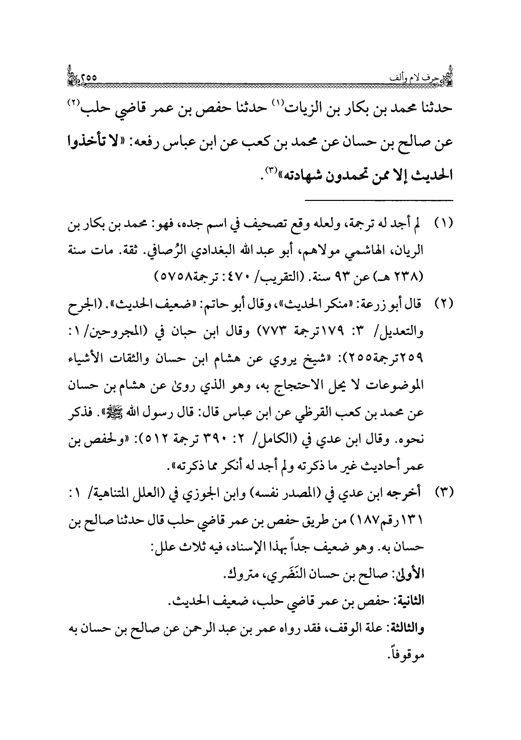 حدثنا محمد بن بكار بن الزيات (١) حدثنا حفص بن عمر قاضي حلب (¬٢) عن صالح بن حسان عن محمد بن كعب عن ابن عباس رفعه: "لا تأخذوا الحديث إلا ممن تحمدون شهادته" (¬٣).