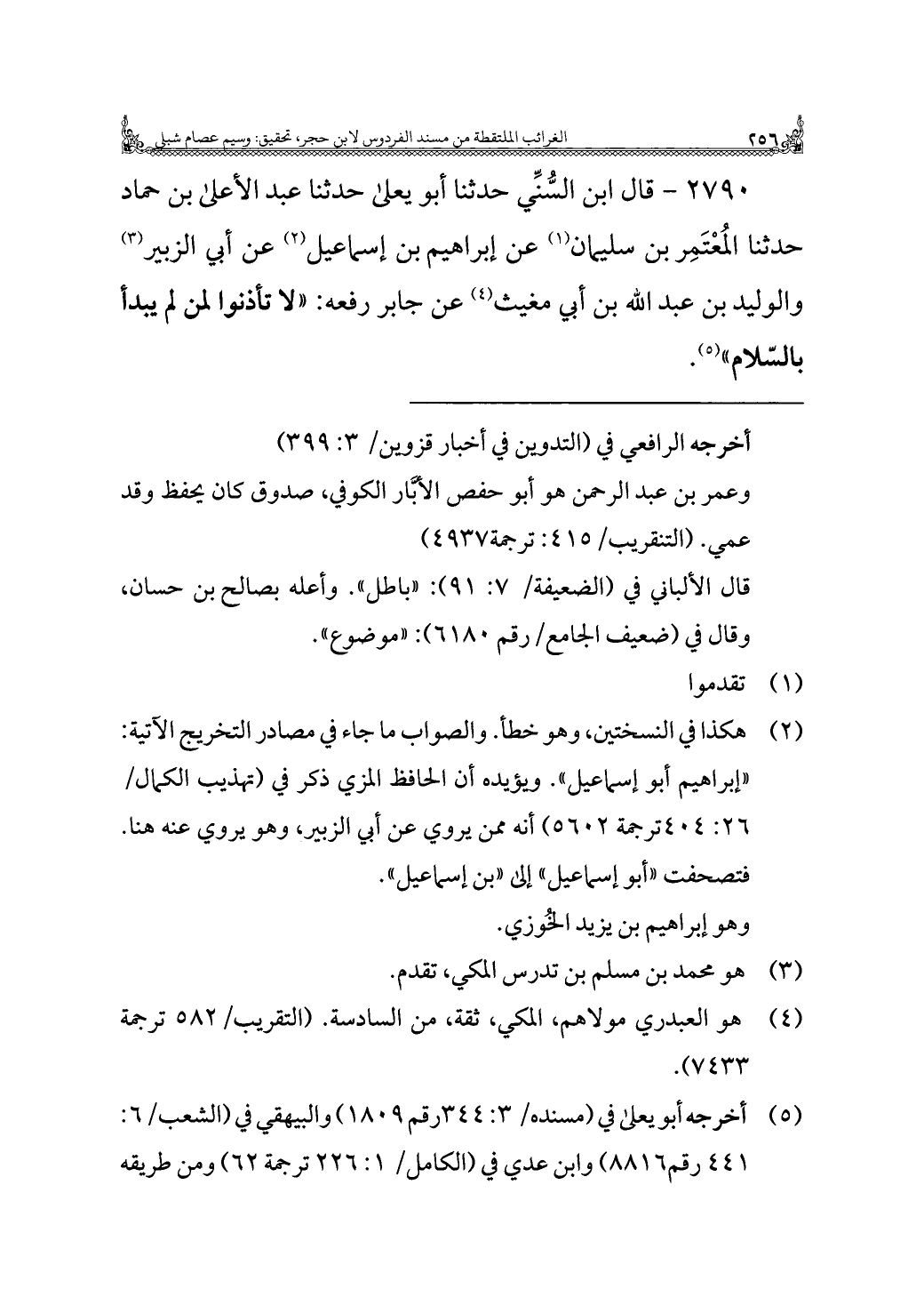 ٢٧٩٠ - قال ابن السُّنِّي حدثنا أبو يعلى حدثنا عبد الأعلى بن حماد حدثنا المُعْتَمِر بن سليمان (¬١) عن إبراهيم بن إسماعيل (¬٢) عن أبي الزبير (¬٣) والوليد بن عبد الله بن أبي مغيث (¬٤) عن جابر رفعه: "لا تأذنوا لمن لم يبدأ بالسلام" (¬٥).