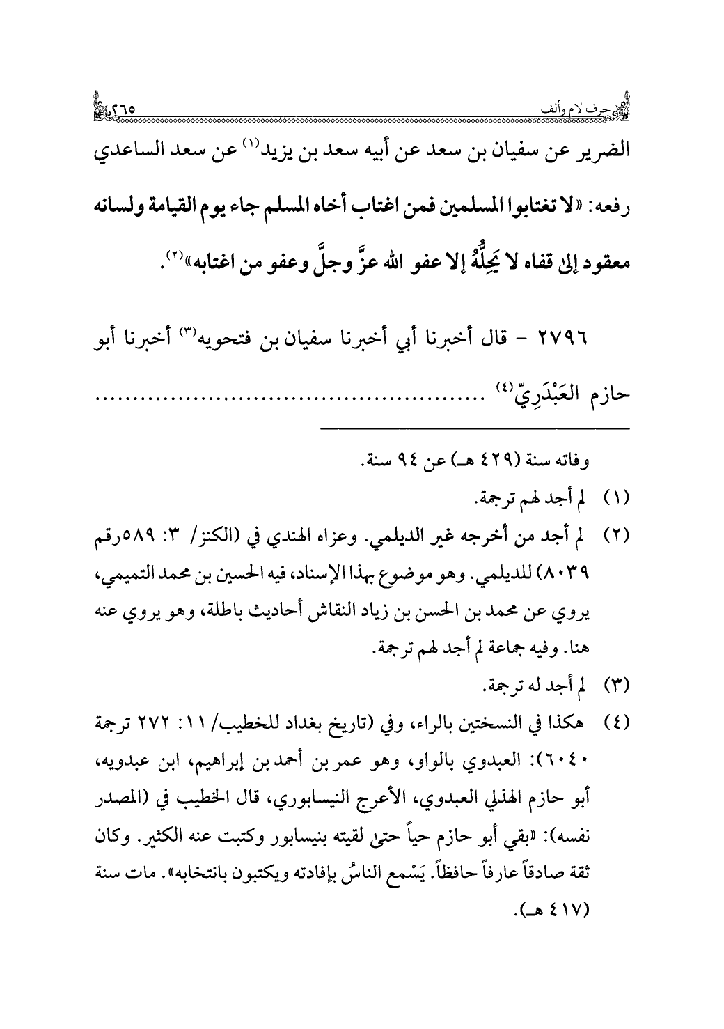الضرير عن سفيان بن سعد عن أبيه سعد بن يزيد (¬١) عن سعد الساعدي رفعه: "لا تغتابوا المسلمين فمن اغتاب أخاه المسلم جاء يوم القيامة ولسانه معقود إلى قفاه لا يَحِلُّهُ إلا عفو الله عزَّ وجلَّ وعفو من اغتابه" (¬٢).
