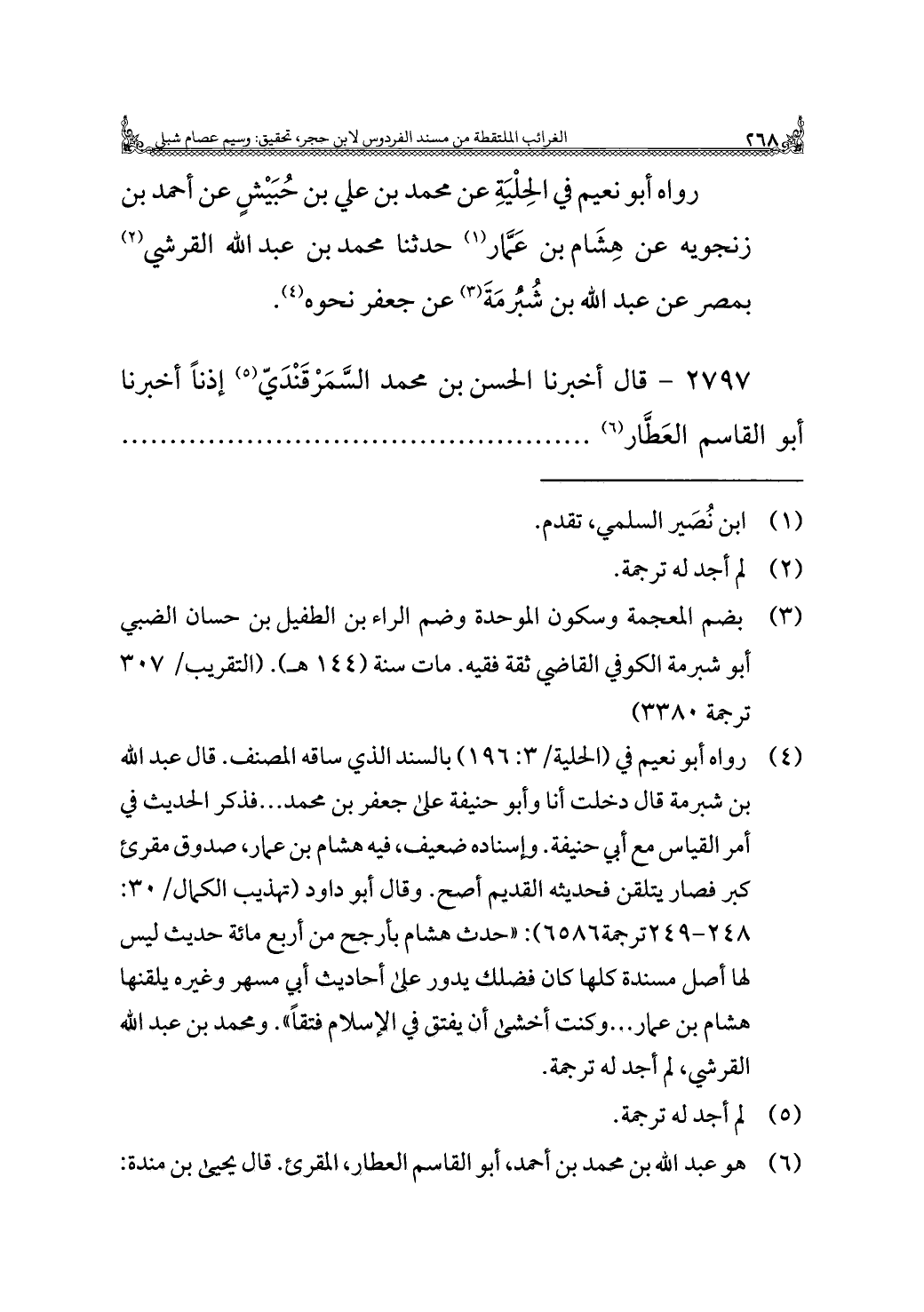 (¬٤) رواه أبو نعيم في (الحلية/ ٣: ١٩٦) بالسند الذي ساقه المصنف. قال عبد الله بن شبرمة قال دخلت أنا وأبو حنيفة على جعفر بن محمد ... فذكر الحديث في أمر القياس مع أبي حنيفة. وإسناده ضعيف، فيه هشام بن عمار، صدوق مقرئ كبر فصار يتلقن فحديثه القديم أصح. وقال أبو داود (تهذيب الكمال/ ٣٠: ٢٤٩ - ٢٤٨ ترجمة ٦٥٨٦): "حدث هشام بأرجح من أربع مائة حديث ليس لها أصل مسندة كلها كان فضلك يدور على أحاديث أبي مسهر وغيره يلقنها هشام بن عمار ... وكنت أخشى أن يفتق في الإِسلام فتقًا". ومحمد بن عبد الله القرشي، لم أجد له ترجمة.