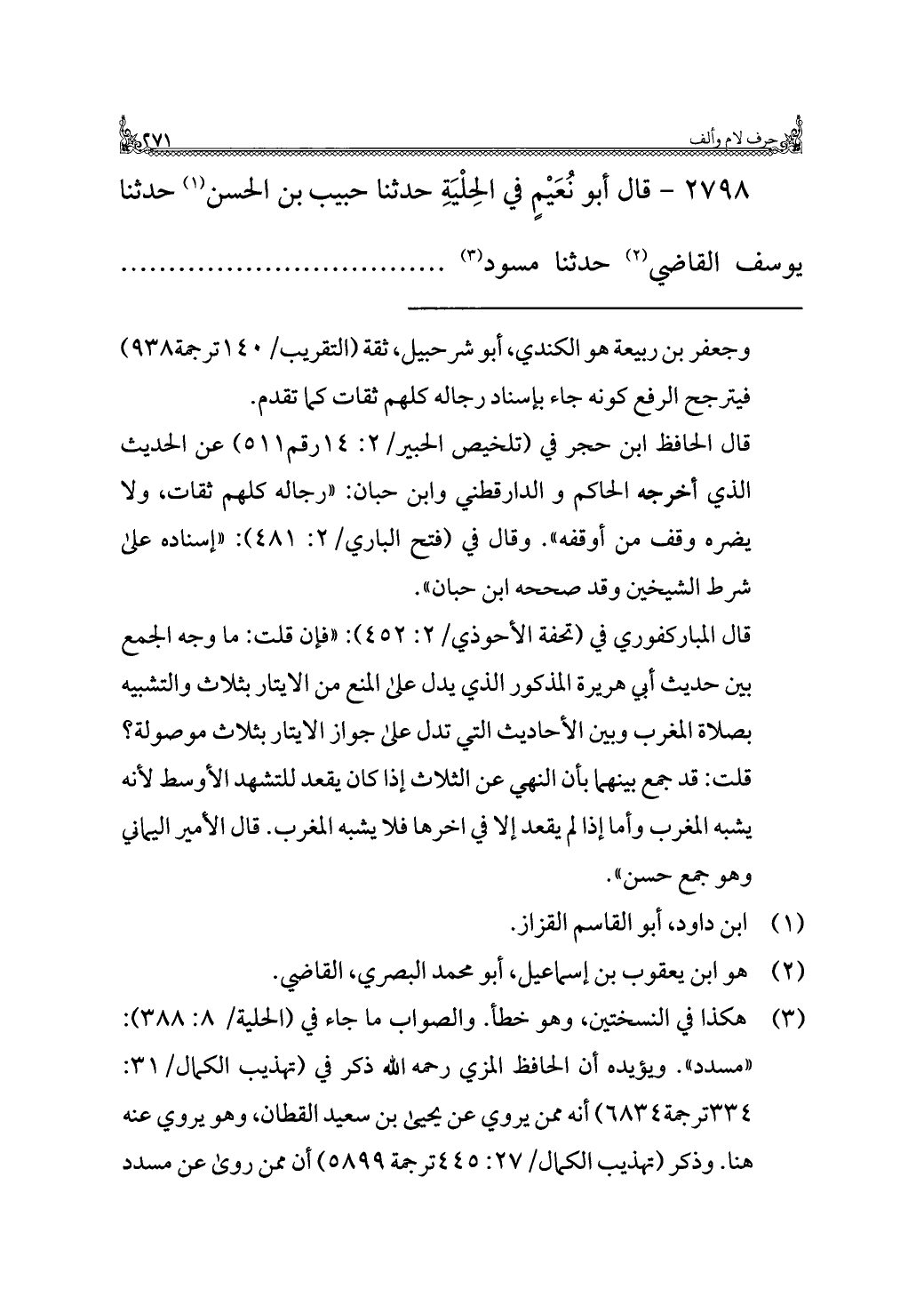 ٢٧٩٨ - قال أبو نُعَيْمٍ في الحِلْيَةِ حدثنا حبيب بن الحسن (¬١) حدثنا يوسف القاضي (¬٢) حدثنا مسود (¬٣) ..................................