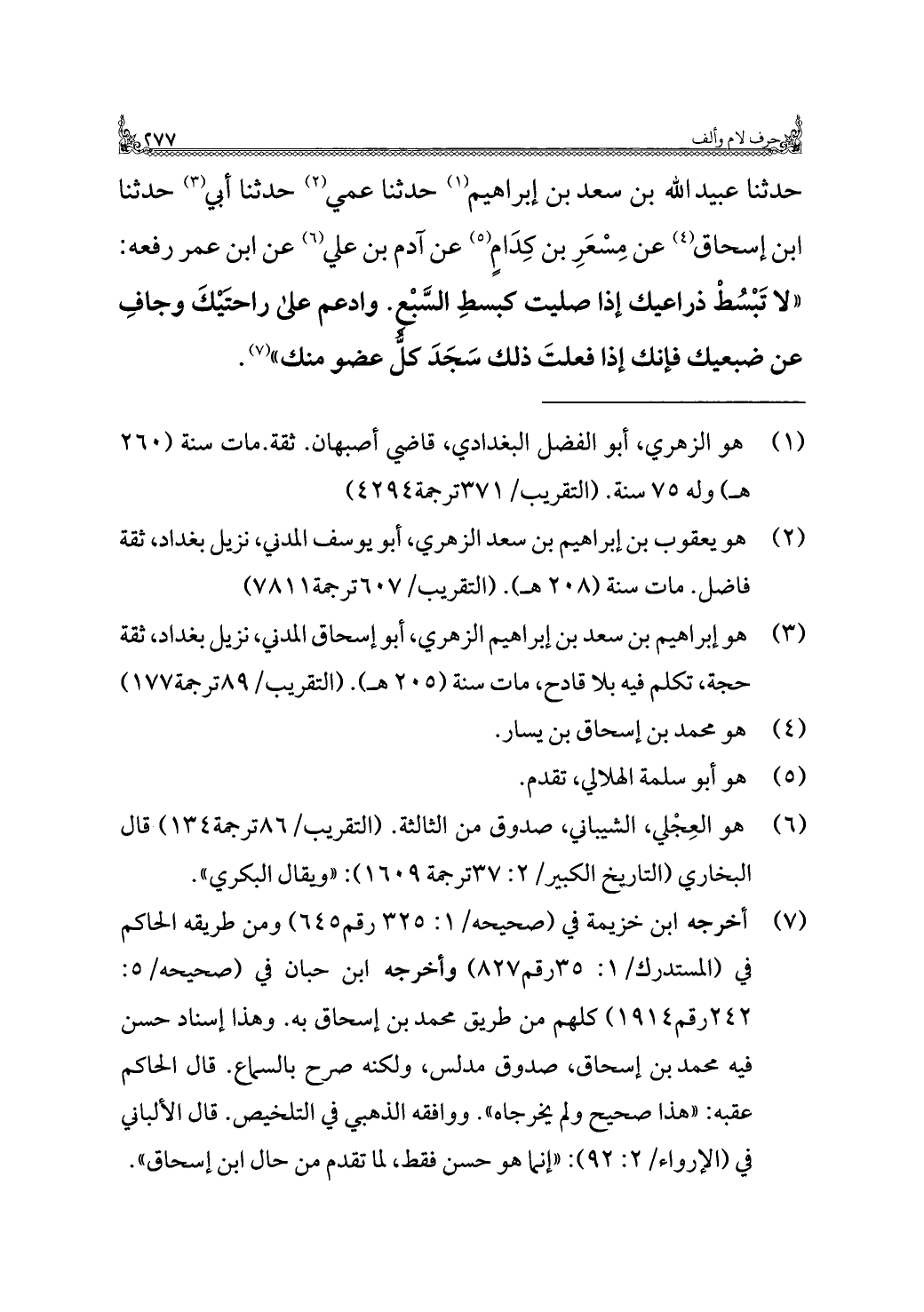 حدثنا عبيد الله بن سعد بن إبراهيم (١) حدثنا عمي (¬٢) حدثنا أبي (¬٣) حدثنا ابن إسحاق (¬٤) عن مِسْعَرِ بن كِدَامٍ (¬٥) عن آدم بن علي (¬٦) عن ابن عمر رفعه: "لا تَبْسُطْ ذراعيك إذا صليت كبسطِ السَّبْعِ. وادعم على راحتَيْكَ وجافِ عن ضبعيك فإنك إذا فعلتَ ذلك سَجَدَ كلُّ عضو منك" (¬٧).