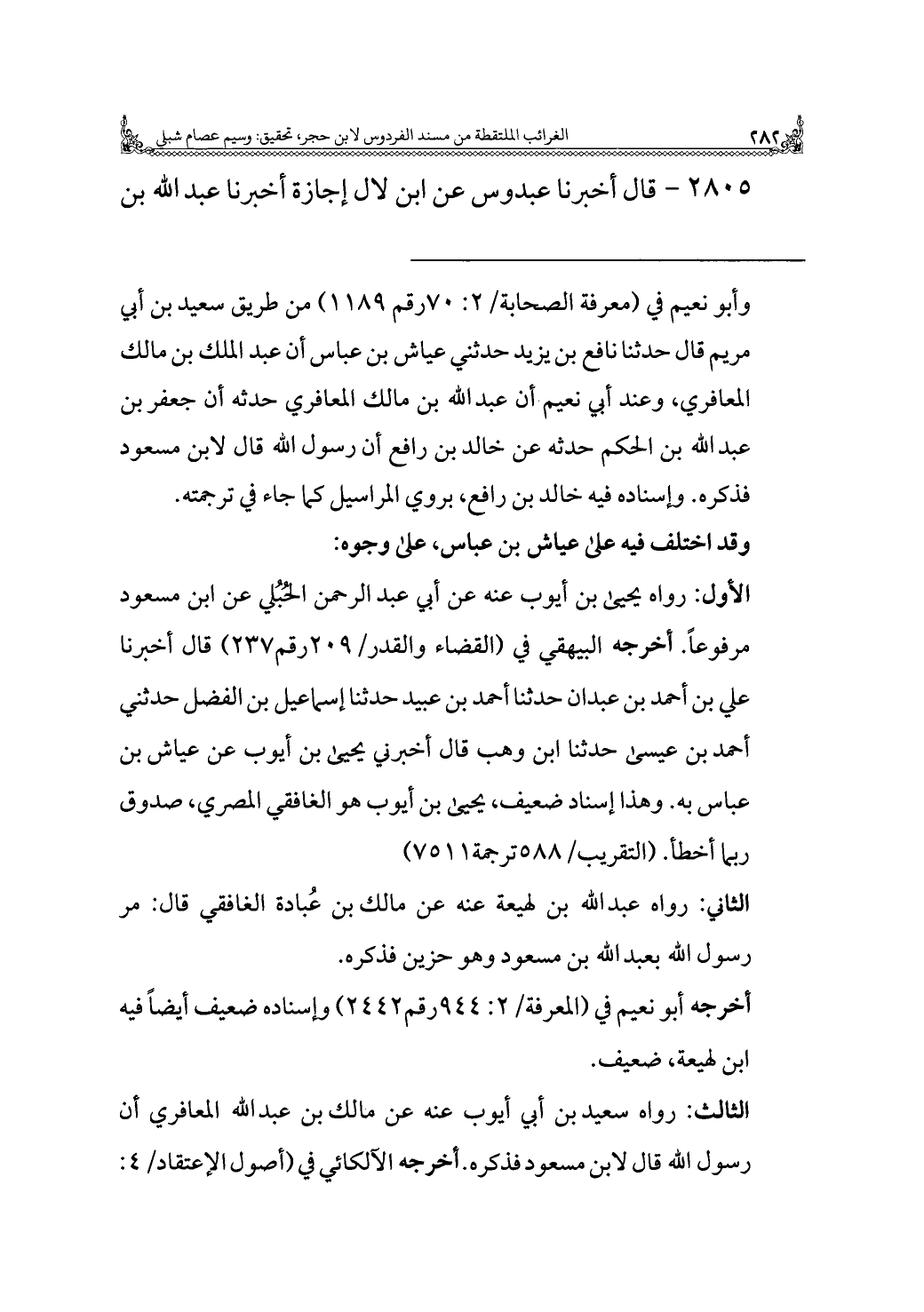 = وأبو نعيم في (معرفة الصحابة/ ٢: ٧٥ رقم ١١٨٩) من طريق سعيد بن أبي مريم قال حدثنا نافع بن يزيد حدثني عياش بن عباس أن عبد الملك بن مالك المعافري، وعند أبي نعيم أن عبد الله بن مالك المعافري حدثه أن جعفر بن عبد الله بن الحكم حدثه عن خالد بن رافع أن رسول الله قال لابن مسعود فذكره. وإسناده فيه خالد بن رافع، يروي المراسيل كما جاء في ترجمته.