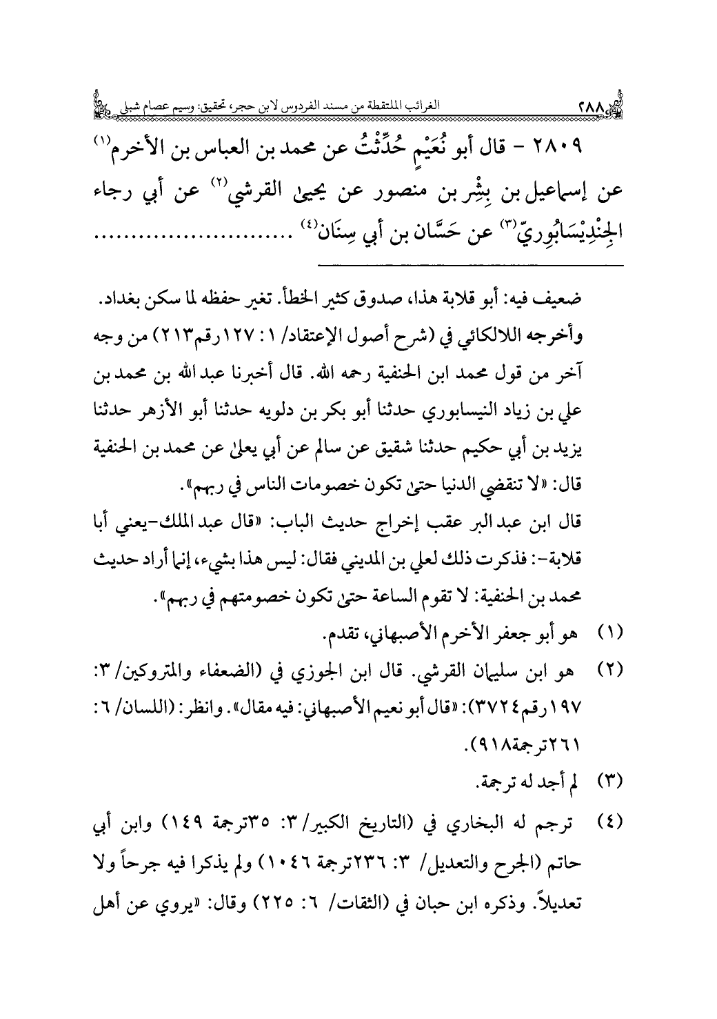 (¬٢) هو ابن سليمان القرشي. قال ابن الجوزي في (الضعفاء والمتروكين/ ٣: ١٩٧ رقم ٣٧٢٤): "قال أبو نعيم الأصبهاني: فيه مقال". وانظر: (اللسان/ ٦: ٢٦١ ترجمة ٩١٨).