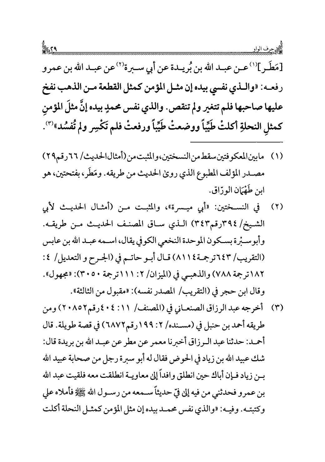 (¬٣) أخرجه عبد الرزاق الصنعاني في (المصنف/ ١١: ٤٠٤ رقم ٢٠٨٥٢) ومن طريقه أحمد بن حنبل في (مسنده / ٢: ١٩٩ رقم ٦٨٧٢) في قصة طويلة. قال أحمد: حدثنا عبد الرزاق أخبرنا معمر عن مطر عن عبد الله بن بريدة قال: شك عبيد الله بن زياد في الحوض فقال له أبو سبرة رجل من صحابة عبيد الله بن زياد فإن أباك حين انطلق وافدًا إلى معاوية انطلقت معه فلقيت عبد الله بن عمرو فحدثني من فيه إلى فيّ حديثًا سمعه من رسول الله -صلى الله عليه وسلم- فأملاه علي وكتبته. وفيه: "والذي نفس محمد بيده إن مثل المؤمن كمثل النحلة أكلت
