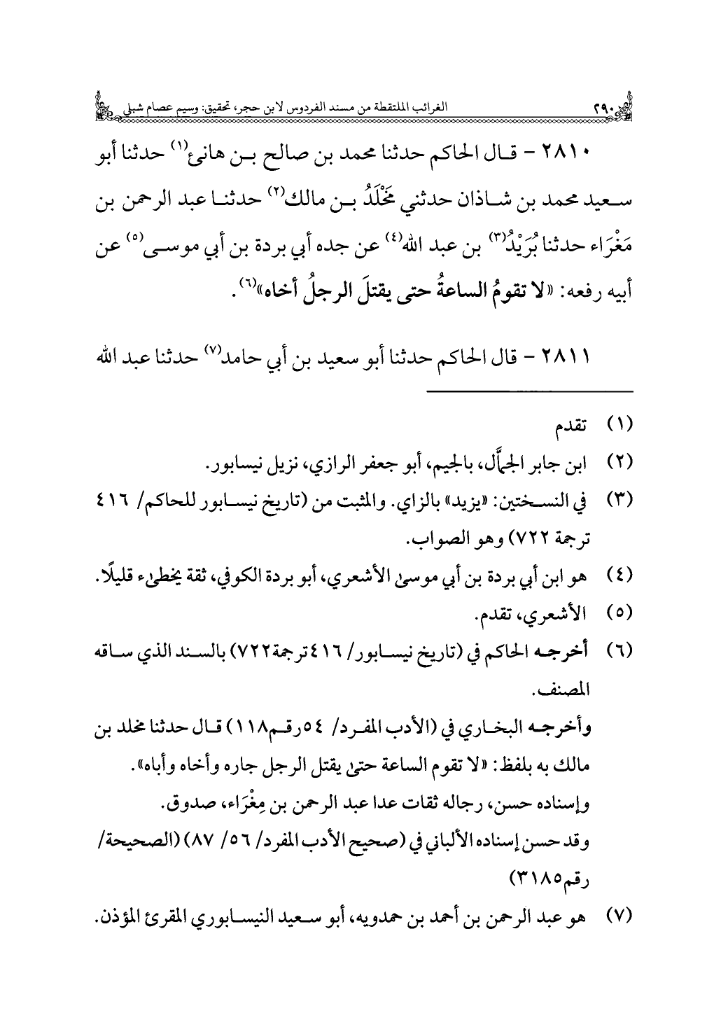 ٢٨١٠ - قال الحاكم حدثنا محمد بن صالح بن هانئ (¬١) حدثنا أبو سعيد محمد بن شاذان حدثني مَخْلَدُ بن مالك (¬٢) حدثنا عبد الرحمن بن مَغْرَاء حدثنا بُرَيْدُ (¬٣) بن عبد الله (¬٤) عن جده أبي بردة بن أبي موسى (¬٥) عن أبيه رفعه: "لا تقومُ الساعةُ حتى يقتلَ الرجلُ أخاه" (¬٦).