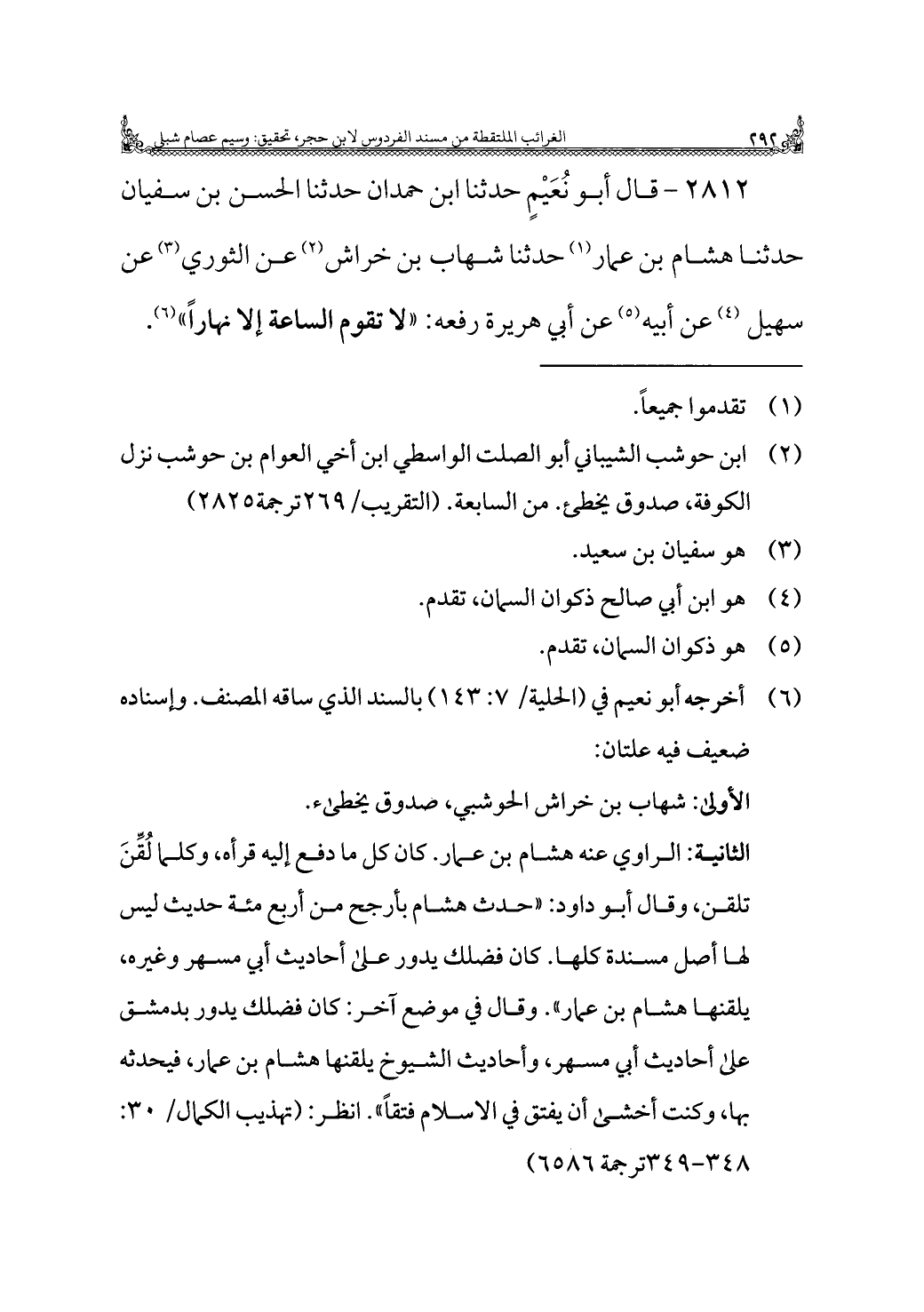 ٢٨١٢ - قال أبو نُعَيْمٍ حدثنا ابن حمدان حدثنا الحسن بن سفيان حدثنا هشام بن عمار (¬١) حدثنا شهاب بن خراش (¬٢) عن الثوري (¬٣) عن سهيل (¬٤) عن أبيه (¬٥) عن أبي هريرة رفعه: "لا تقوم الساعة إلا نهارًا" (¬٦).