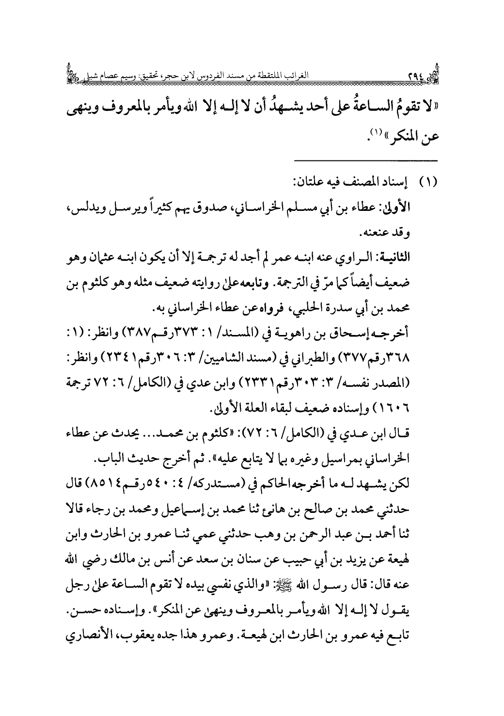 لكن يشهد له ما أخرجه الحاكم في (مستدركه/ ٤: ٥٤٠ رقم ٨٥١٤) قال حدثني محمد بن صالح بن هانئ ثنا محمد بن إسماعيل ومحمد بن رجاء قالا ثنا أحمد بن عبد الرحمن بن وهب حدثني عمي ثنا عمرو بن الحارث وابن لهيعة عن يزيد بن أبي حبيب عن سنان بن سعد عن أنس بن مالك رضي الله عنه قال: قال رسول الله - صَلَّى اللهُ عَلَيْهِ وَسَلَّمَ -: "والذي نفسي بيده لا تقوم الساعة على رجل يقول لا إله إلا الله ويأمر بالمعروف وينهى عن المنكر، وإسناده حسن. تابع فيه عمرو بن الحارث ابن لهيعة. وعمرو هذا جده يعقوب، الأنصاري =