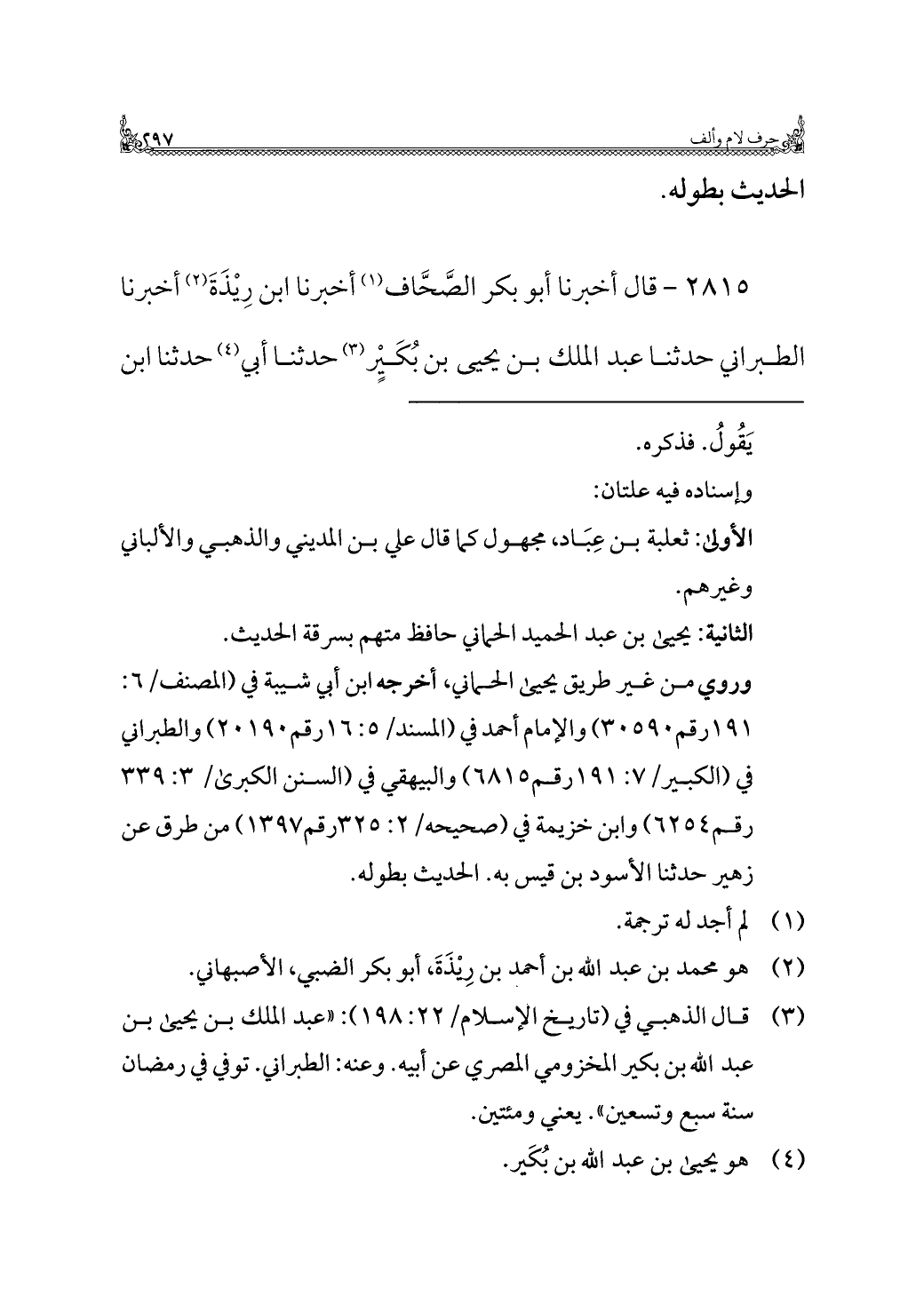 ٢٨١٥ - قال أخبرنا أبو بكر الصَّحَّاف (¬١) أخبرنا ابن رِيْذَةَ (¬٢) أخبرنا الطبراني حدثنا عبد الملك بن يحيى بن بُكَيْرٍ (¬٣) حدثنا أبي (¬٤) حدثنا ابن