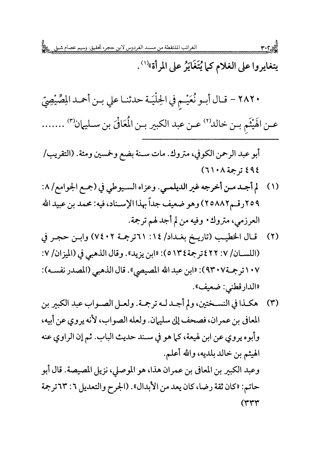 (¬٢) قال الخطيب (تاريخ بغداد/ ١٤: ٦١ ترجمة ٧٤٠٢) وابن حجر في (اللسان/ ٧: ٤٢٢ ترجمة ٥١٣٤): "ابن يزيد". وقال الذهبي في (الميزان/ ٧: ١٠٧ ترجمة ٩٣٠٧): "ابن عبد الله المصيصي". قال الذهبي (المصدر نفسه): "الدارقطني: ضعيف".