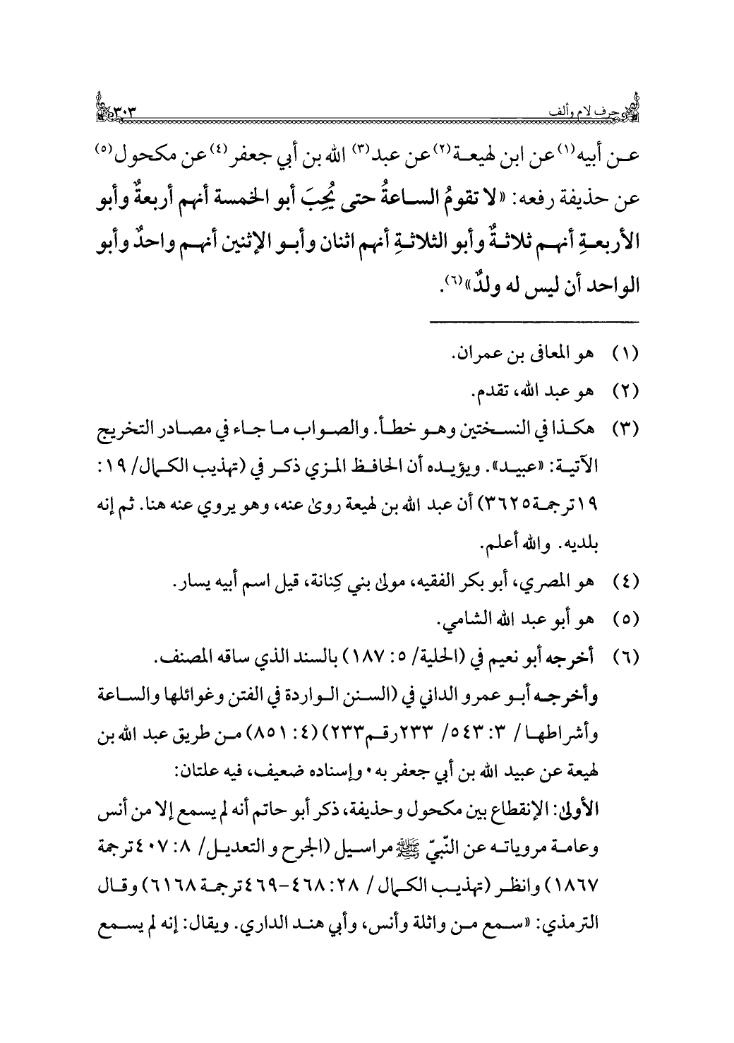 عن أبيه (¬١) عن ابن لهيعة (¬٢) عن عبد (¬٣) الله بن أبي جعفر (¬٤) عن مكحول (¬٥) عن حذيفة رفعه: "لا تقومُ الساعةُ حتى يُحِبَ أبو الخمسة أنهم أربعة وأبو الأربعةِ أنهم ثلاثة وأبو الثلاثةِ أنهم اثنان وأبو الإثنين أنهم واحد وأبو الواحد أن ليس له ولدٌ" (¬٦).