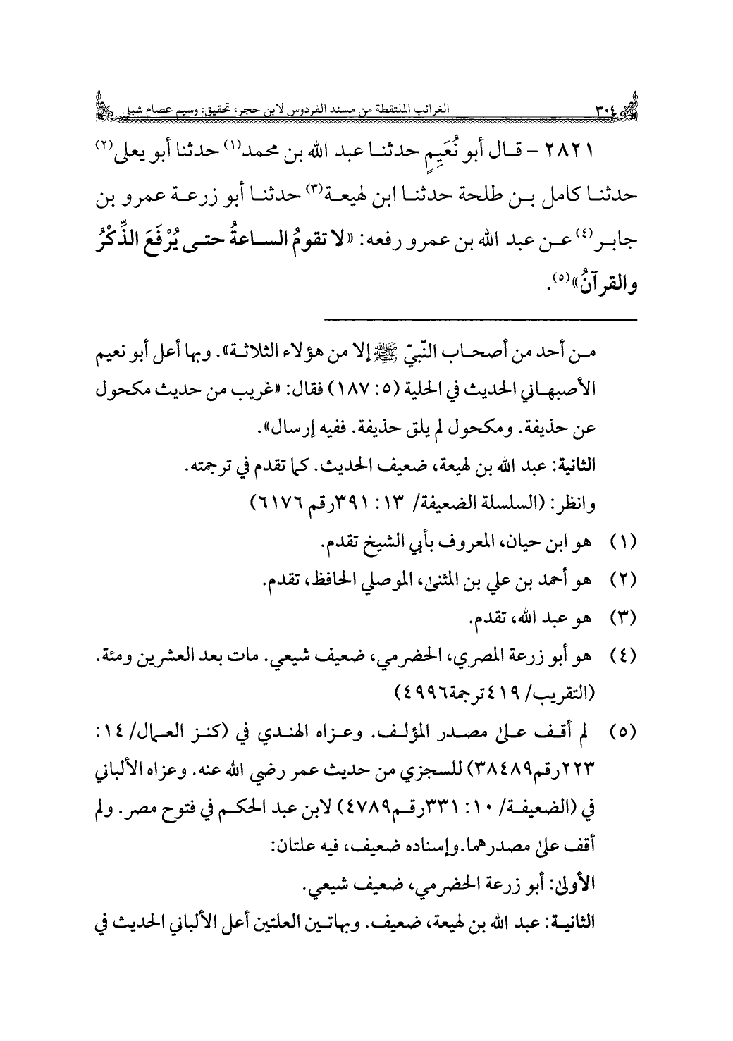 ٢٨٢١ - قال أبو نُعَيِمٍ حدثنا عبد الله بن محمد (¬١) حدثنا أبو يعلى (¬٢) حدثنا كامل بن طلحة حدثنا ابن لهيعة (¬٣) حدثنا أبو زرعة عمرو بن جابر (¬٤) عن عبد الله بن عمرو رفعه: "لا تقومُ الساعةُ حتى يُرْفَعَ الذِّكرُ والقرآنُ" (¬٥).