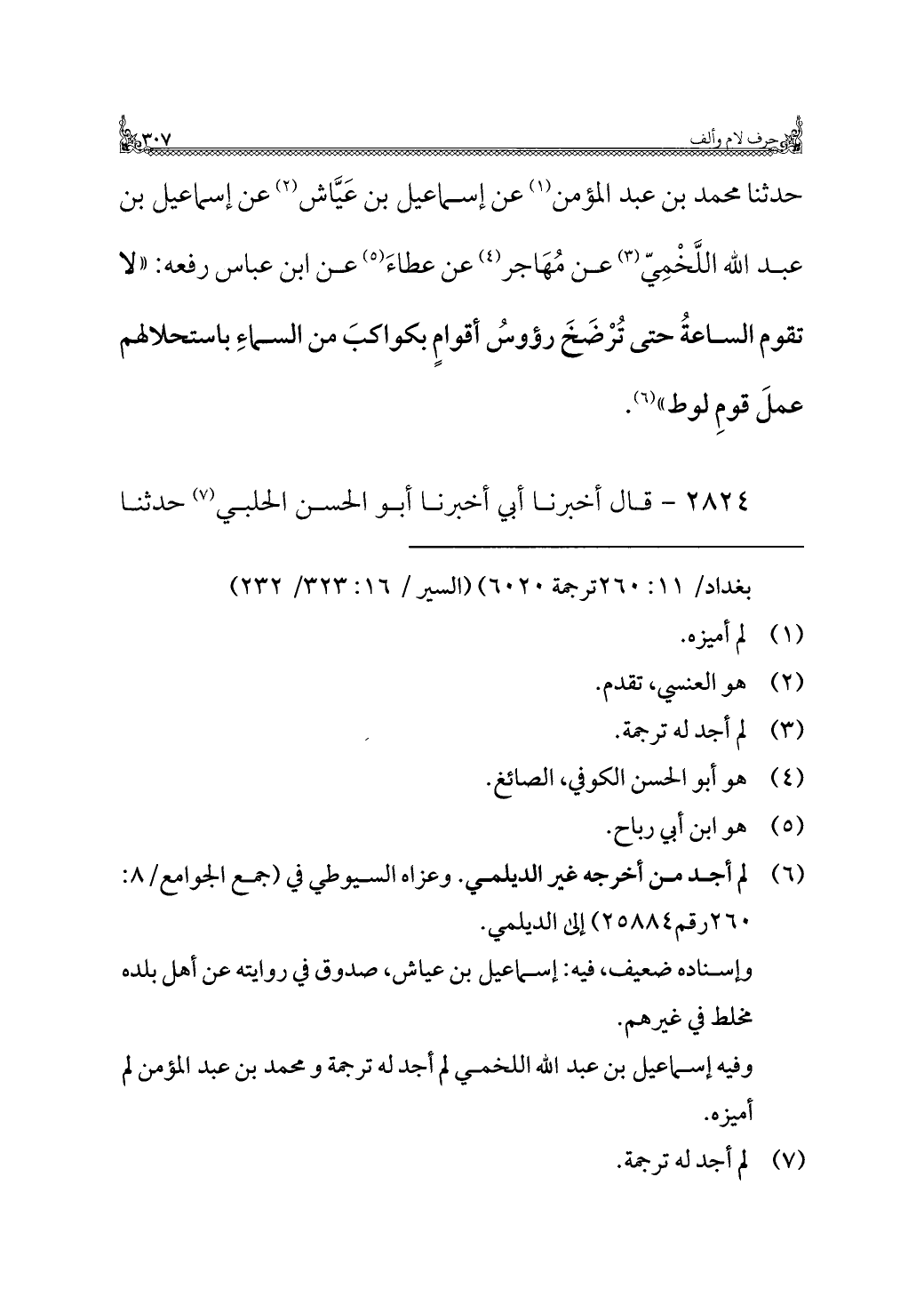 وفيه إسماعيل بن عبد الله اللخمي لم أجد له ترجمة ومحمد بن عبد المؤمن لم أميزه.