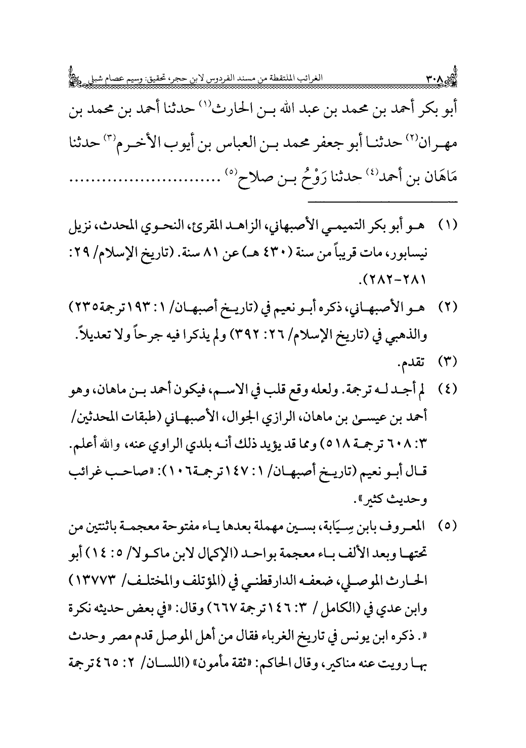 (¬٢) هو الأصبهاني، ذكره أبو نعيم في (تاريخ أصبهان/ ١: ١٩٣ ترجمة ٢٣٥) والذهبي في (تاريخ الإسلام/ ٢٦: ٣٩٢) ولم يذكرا فيه جرحًا ولا تعديلًا.