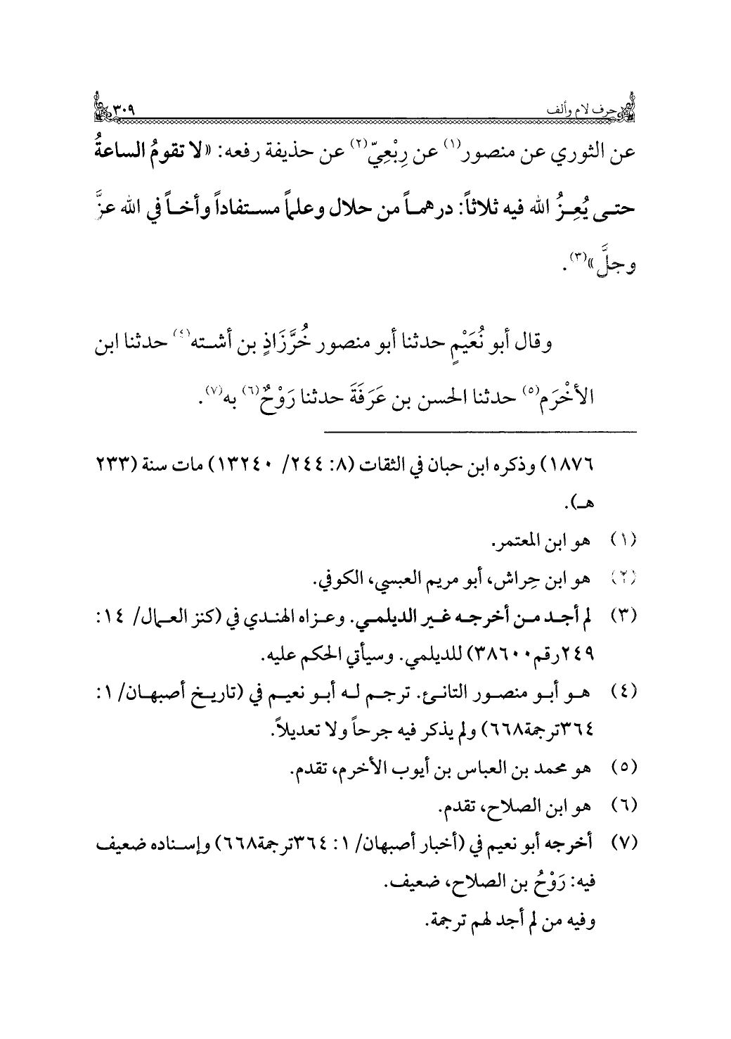 (¬٧) أخرجه أبو نعيم في (أخبار أصبهان/ ١: ٣٦٤ ترجمة ٦٦٨) وإسناده ضعيف فيه: رَوْحُ بن الصلاح، ضعيف.