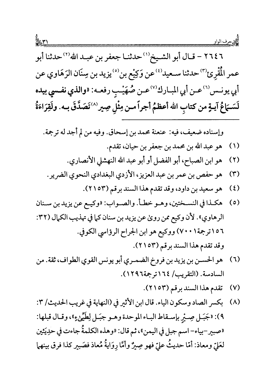 ٢٦٤٦ - قال أبو الشيخ (¬١) حدثنا جعفر بن عبد الله (¬٢) حدثنا أبو عمر المُقْرِئ (¬٣) حدثنا سعيد (¬٤) عن وَكِيْع بن (¬٥) يزيد بن سِنَان الرَهَاوي عن أبي يونس (¬٦) عن أبي المبارك (¬٧) عن صُهَيْبٍ رفعه: "والذي نفسي بيده لَسَمَاعُ آيةٍ من كتابِ الله أعظمُ أجرًا من مِثْلِ صِير (¬٨) تَصَدَّقَ به. ولَقِرَاءَةُ