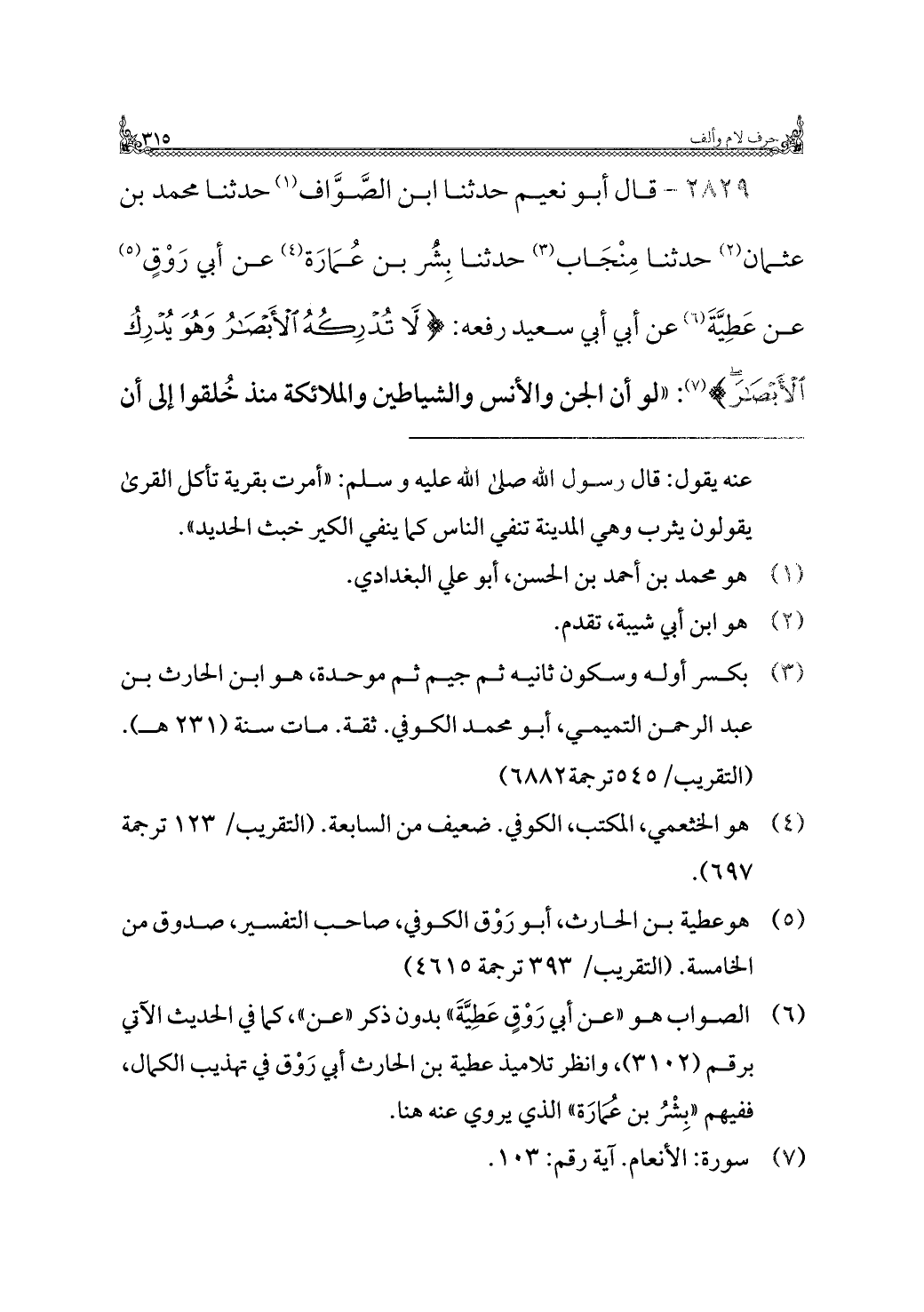 ٢٨٢٩ - قال أبو نعيم حدثنا ابن الصَّوَّاف (¬١) حدثنا محمد بن عثمان (¬٢) حدثنا مِنْجَاب (¬٣) حدثنا بِشر بن عُمَارَة (¬٤) عن أبي رَوْقٍ (¬٥) عن عَطِيَّةَ (¬٦) عن أبي أبي سعيد رفعه: {لَا تُدْرِكُهُ الْأَبْصَارُ وَهُوَ يُدْرِكُ الْأَبْصَارَ} (¬٧): "لوأن الجن والإنس والشياطين والملائكة منذ خُلقوا إلى أن