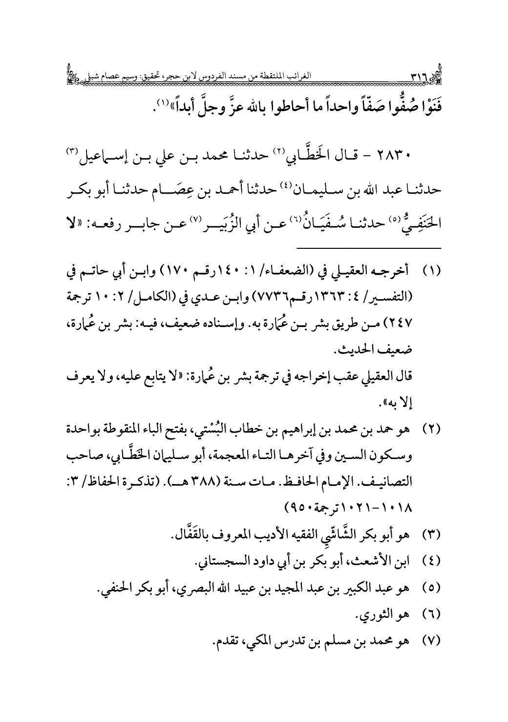 ٢٨٣٠ - قال الخَطَّابي (¬٢) حدثنا محمد بن علي بن إسماعيل (¬٣) حدثنا عبد الله بن سليمان (¬٤) حدثنا أحمد بن عِصَام حدثنا أبو بكر الحنَفِيُّ (¬٥) حدثنا سُفَيَانُ (¬٦) عن أبي الزُبَير (¬٧) عن جابر رفعه: "لا