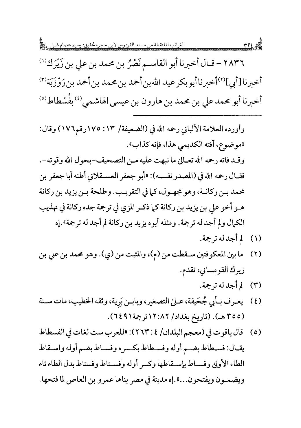 ٢٨٣٦ - قال أخبرنا أبو القاسم نَصْرُ بن محمد بن علي بن زَيْرَك (¬١) أخبرنا [أبي] (¬٢) أخبرنا أبو بكر عبد الله بن أحمد بن محمد بن أحمد بن رَوْزَبَة (¬٣) أخبرنا أبو محمد علي بن محمد بن هارون بن عيسى الهاشمي (¬٤) بفُسْطاط (¬٥)