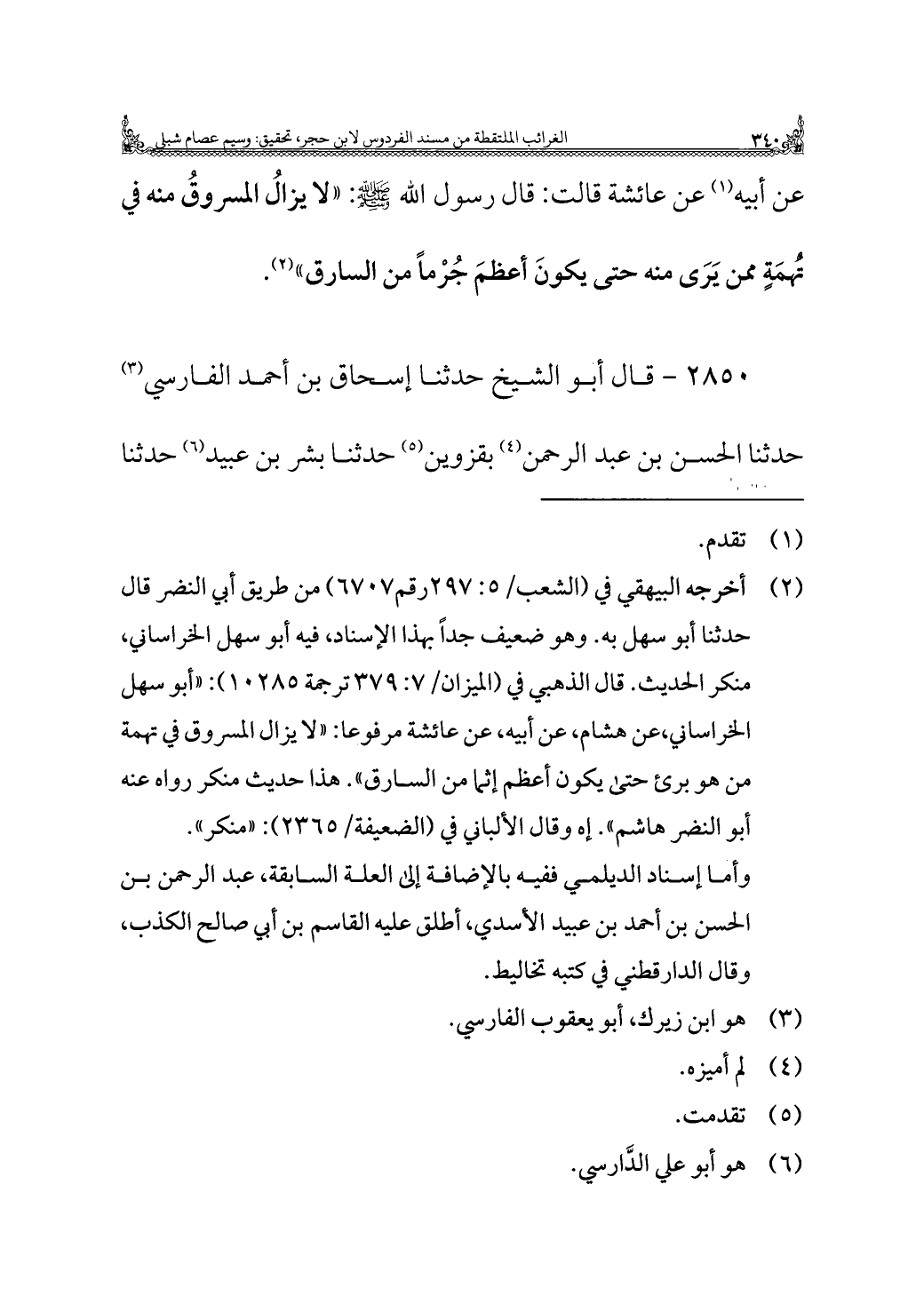 (¬٢) أخرجه البيهقي في (الشعب/ ٥: ٢٩٧ رقم ٦٧٠٧) من طريق أبي النضر قال حدثنا أبو سهل به. وهو ضعيف جدًّا بهذا الإسناد، فيه أبو سهل الخراساني، منكر الحديث. قال الذهبي في (الميزان/ ٧: ٣٧٩ ترجمة ١٠٢٨٥): "أبو سهل الخراساني، عن هشام، عن أبيه، عن عائشة مرفوعًا: "لا يزال المسروق في تهمة من هو برئ حتى يكون أعظم إثما من السارق". هذا حديث منكر رواه عنه أبو النضر هاشم". إه وقال الألباني في (الضعيفة/ ٢٣٦٥): "منكر".