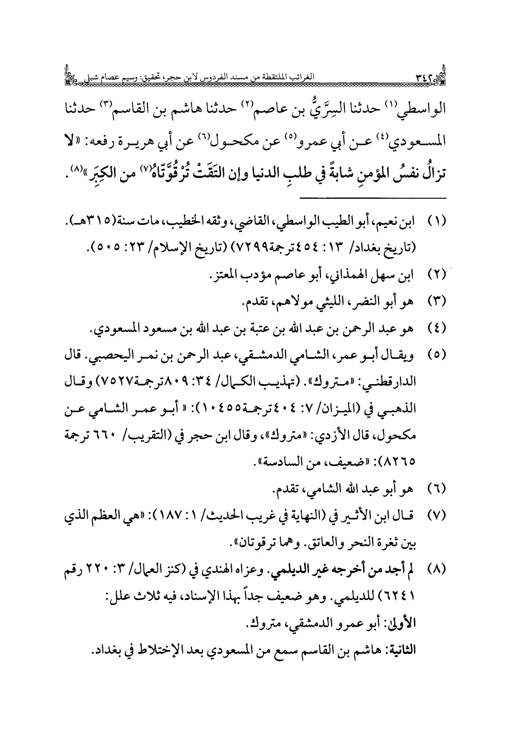 الواسطي (¬١) حدثنا السِرَّيُّ بن عاصم (¬٢) حدثنا هاشم بن القاسم (¬٣) حدثنا المسعودي (¬٤) عن أبي عمرو (¬٥) عن مكحول (¬٦) عن أبي هريرة رفعه: "لا تزالُ نفسُ المؤمنِ شابةً في طلبِ الدنيا وإن التَقَتْ تُرْقُوَّتّاه (¬٧) من الكِبَر" (¬٨).