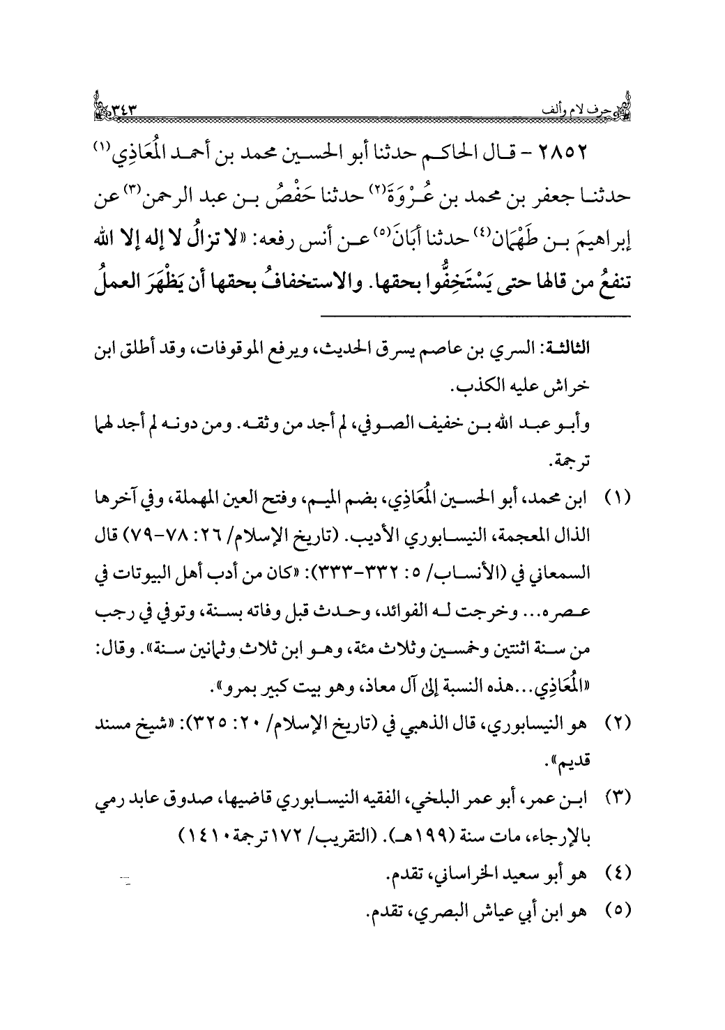٢٨٥٢ - قال الحاكم حدثنا أبو الحسين محمد بن أحمد المُعَاذِي (¬١) حدثنا جعفر بن محمد بن عُرْوَةَ (¬٢) حدثنا حَفْصُ بن عبد الرحمن (¬٣) عن إبراهيمَ بن طَهْمَان (¬٤) حدثنا أبانَ (¬٥) عن أنس رفعه: "لا تزالُ لا إله إلا الله تنفعُ من قالها حتى يَسْتَخِفُّوا بحقها. والاستخفافُ بحقها أن يَظْهَرَ العملُ