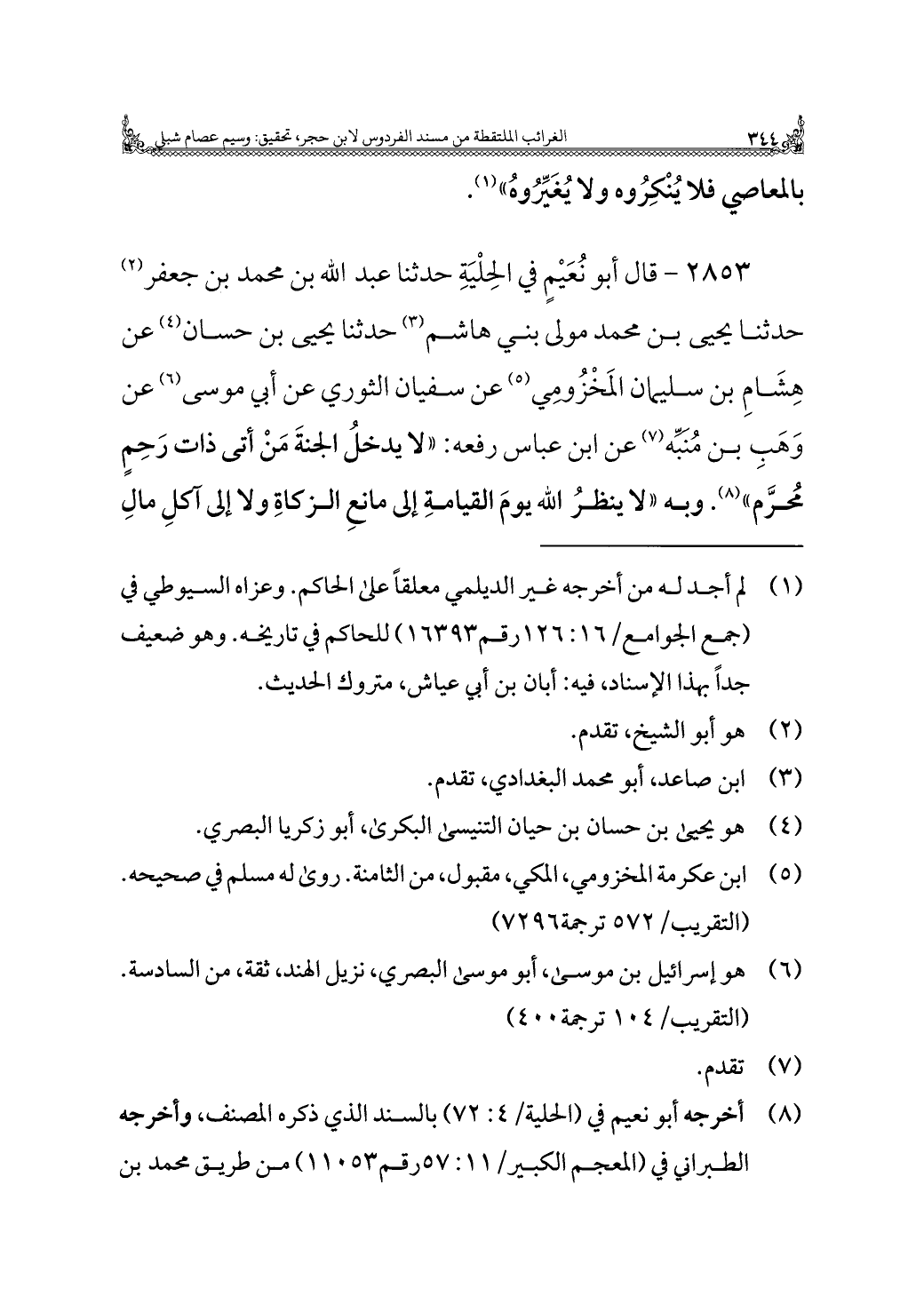 ٢٨٥٣ - قال أبو نُعَيْمٍ في الحِلْيَةِ حدثنا عبد الله بن محمد بن جعفر (¬٢) حدثنا يحيى بن محمد مولى بني هاشم (¬٣) حدثنا يحيى بن حسان (¬٤) عن هِشَامِ بن سليمان المَخْزُومِي (¬٥) عن سفيان الثوري عن أبي موسى (¬٦) عن وَهَبِ بن مُنبِّه (¬٧) عن ابن عباس رفعه: "لا يدخلُ الجنَّةَ مَنْ أتى ذات رَحِمٍ مُحرَّم" (¬٨). وبه "لا ينظرُ الله يومَ القيامةِ إلى مانعِ الزكاةِ ولا إلى آكلِ مالِ