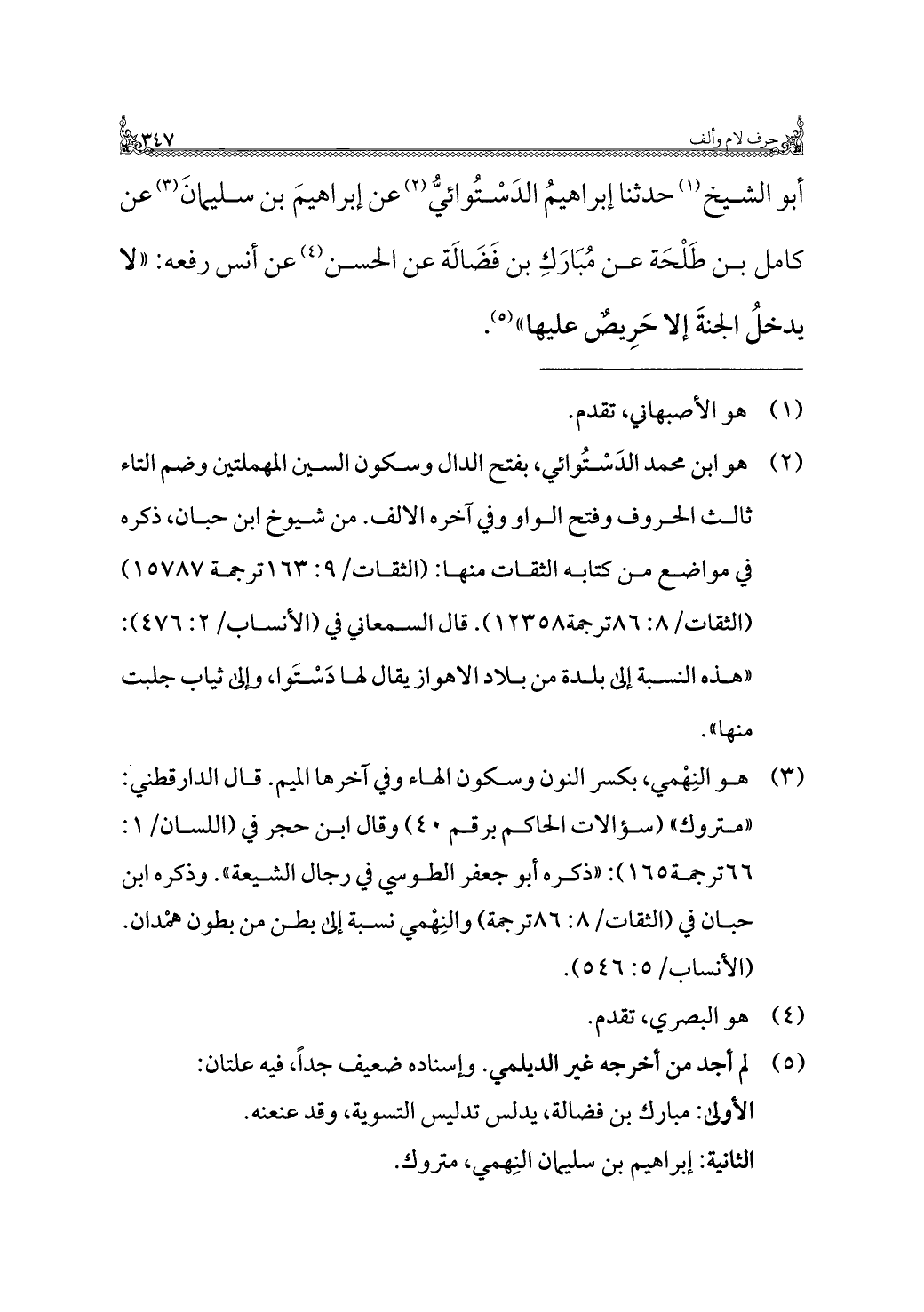 أبو الشيخ (¬١) حدثنا إبراهيمُ الدَسْتُوائيُّ (¬٢) عن إبراهيمَ بن سليمانَ (¬٣) عن كامل بن طَلْحَة عن مُبَارَكِ بن فَضَالَة عن الحسن (¬٤) عن أنس رفعه: "لا يدخلُ الجنَّةَ إلا حَرِيص عليها" (¬٥).