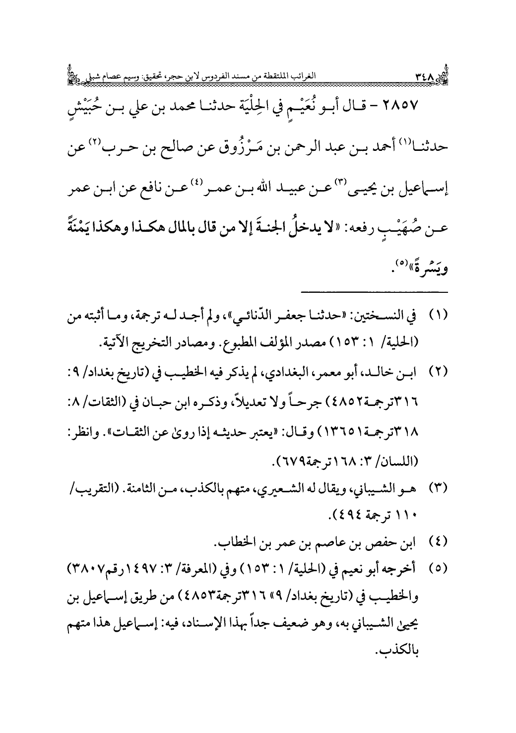 ٢٨٥٧ - قال أبو نُعَيْمٍ في الحِلْيَة حدثنا محمد بن علي بن حُبَيْشٍ حدثنا (¬١) أحمد بن عبد الرحمن بن مَرْزُوق عن صالح بن حرب (¬٢) عن إسماعيل بن يحيى (¬٣) عن عبيد الله بن عمر (¬٤) عن نافع عن ابن عمر عن صُهَيْبٍ رفعه: "لا يدخلُ الجنَّةَ إلا من قال بالمال هكذا وهكذا يَمْنَةً ويَسرةً" (¬٥).