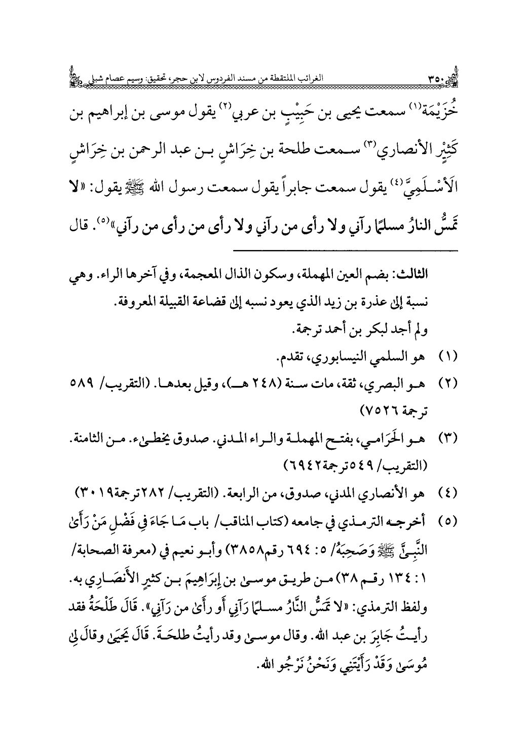 (¬٥) أخرجه الترمذي في جامعه (كتاب المناقب/ باب مَا جَاءَ في فَضْلِ مَنْ رَأَى النَّبيّ - صلى الله عليه وسلم - وَصَحِبَهُ/ ٥: ٦٩٤ رقم ٣٨٥٨) وأبو نعيم في (معرفة الصحابة/ ١: ١٣٤ رقم ٣٨) من طريق موسى بن إِبرَاهِيمَ بن كثير الأَنصَارِي به. ولفظ الترمذي: "لا تَمسُّ النَّارُ مسلمًا رَآنِي أَو رأَى من رَآنِي". قَالَ طَلْحَةُ فقد رأيتُ جَابِرَ بن عبد الله. وقال موسى وقد رأيتُ طلحَةَ. قَالَ يَحيى وقالَ لي مُوسَى وَقَدْ رَأَيْتَنِي وَنَحْنُ نَرْجُو الله.