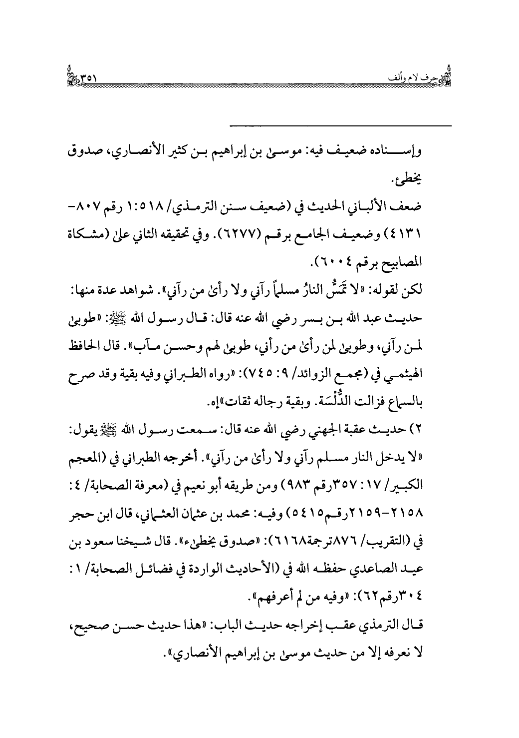 ٢) حديث عقبة الجهني رضي الله عنه قال: سمعت رسول الله - صلى الله عليه وسلم - يقول: "لا يدخل النار مسلم رآني ولا رأى من رآني". أخرجه الطبراني في (المعجم الكبير/ ١٧: ٣٥٧ رقم ٩٨٣) ومن طريقه أبو نعيم في (معرفة الصحابة/ ٤: ٢١٥٨ - ٢١٥٩ رقم ٥٤١٥) وفيه: محمد بن عثمان العثماني، قال ابن حجر في (التقريب/ ٨٧٦ ترجمة ٦١٦٨): "صدوق يخطئ". قال شيخنا سعود بن عيد الصاعدي حفظه الله في (الأحاديث الواردة في فضائل الصحابة/ ١: ٣٠٤ رقم ٦٢): "وفيه من لم أعرفهم".