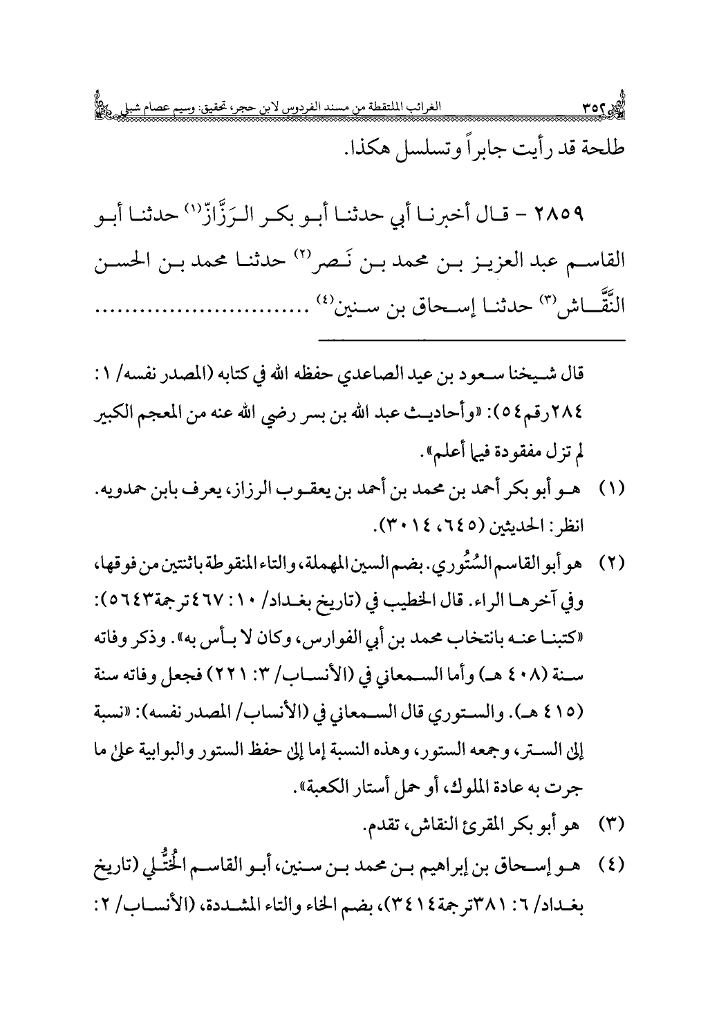 ٢٨٥٩ - قال أخبرنا أبي حدثنا أبو بكر الرَزَّازّ (¬١) حدثنا أبو القاسم عبد العزيز بن محمد بن نَصر (¬٢) حدثنا محمد بن الحسن النَّقَّاش (¬٣) حدثنا إسحاق بن سنين (¬٤) .............................