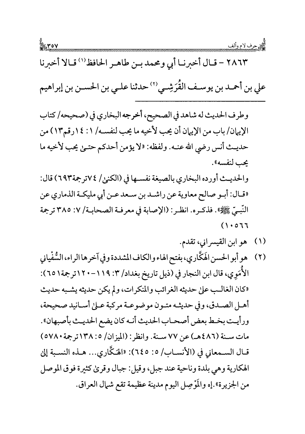 (¬٢) هو أبو الحسن الَهكَّاري، بفتح الهاء والكاف المشددة وفي آخرها الراء، السفْياني الأُمَوِي، قال ابن النجار في (ذيل تاريخ بغداد/ ٣: ١١٩ - ١٢٠ ترجمة ٦٥١): "كان الغالب على حديثه الغرائب والمنكرات، ولم يكن حديثه يشبه حديث أهل الصدق، وفي حديثه متون موضوعة مركبة على أسانيد صحيحة، ورأيت بخطِّ بعض أصحاب الحديث أنه كان يضع الحديث بأصبهان". مات سنة (٤٨٦ هـ) عن ٧٧ سنة. وانظر: (الميزان/ ٥: ١٣٨ ترجمة ٥٧٨٠) قال السمعاني في (الأنساب/ ٥: ٦٤٥): "الهكَّاري ... هذه النسبة إلى الهكارية وهي بلدة وناحية عند جبل، وقيل: جبال وقرى كثيرة فوق الموصل من الجزيرة". إه والمَوْصِل اليوم مدينة عظيمة تقع شمال العراق.