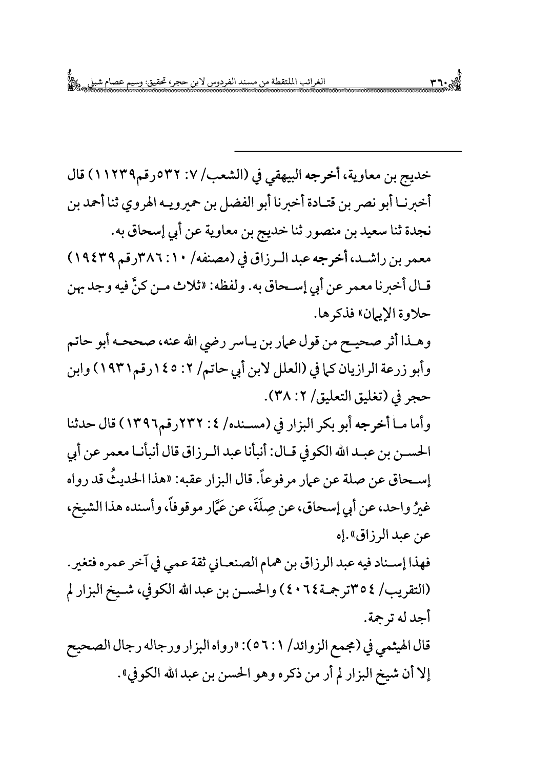 قال الهيثمي في (مجمع الزوائد/ ١: ٥٦): "رواه البزار ورجاله رجال الصحيح إلا أن شيخ البزار لم أر من ذكره وهو الحسن بن عبد الله الكوفي".
