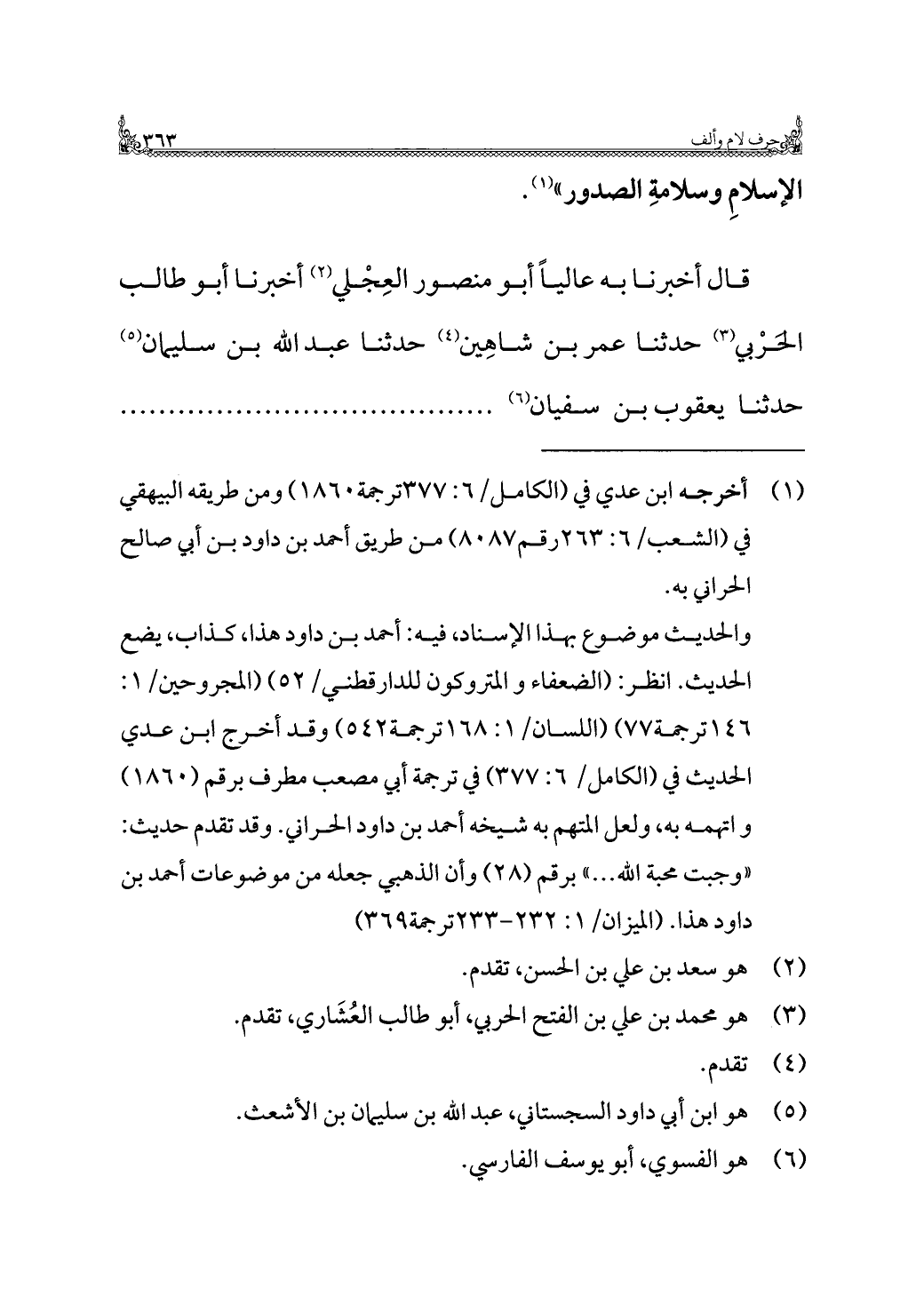 (¬١) أخرجه ابن عدي في (الكامل/ ٦: ٣٧٧ ترجمة ١٨٦٠) ومن طريقه البيهقي في (الشعب/ ٦: ٢٦٣ رقم ٨٠٨٧) من طريق أحمد بن داود بن أبي صالح الحراني به.