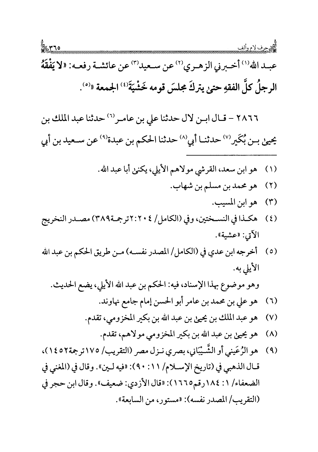 عبد الله (¬١) أخبرني الزهري (¬٢) عن سعيد (¬٣) عن عائشة رفعه: "لا يَفْقَهُ الرجلُ كلَّ الفقهِ حتى يتركَ مجلسَ قومه خَشْيَةَ (¬٤) الجمعة" (¬٥).