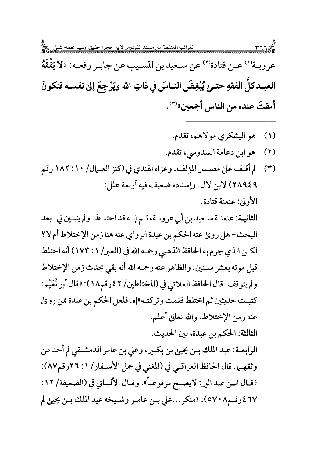 عروبة (¬١) عن قتادة (¬٢) عن سعيد بن المسيب عن جابر رفعه: "لا يَفْقَهُ العبد كلَّ الفقهِ حتى يُبْغِضَ النّاسَ في ذاتِ الله وَيرْجعَ إلى نفسه فتكونَ أمقتَ عنده من الناس أجمعين" (¬٣).