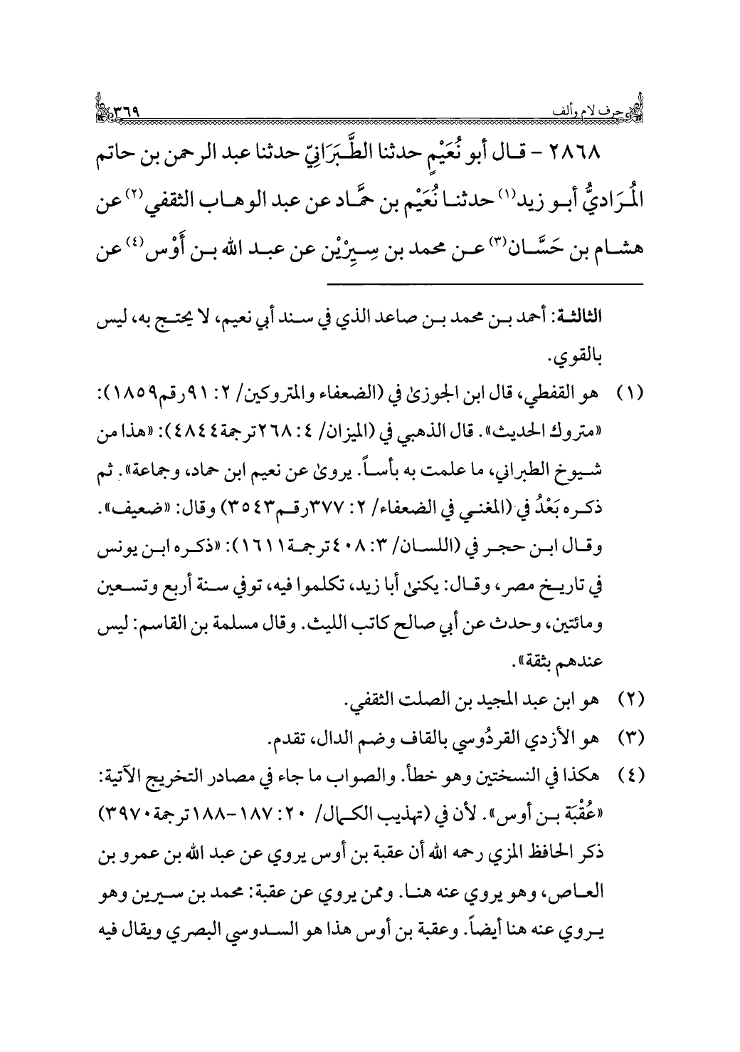 ٢٨٦٨ - قال أبو نُعَيْمٍ حدثنا الطَّبَرَانِيّ حدثنا عبد الرحمن بن حاتم المُرَاديُّ أبو زيد (¬١) حدثنا نُعَيْم بن حمَّاد عن عبد الوهاب الثقفي (¬٢) عن هشام بن حَسَّان (¬٣) عن محمد بن سِيِرين عن عبد الله بن أَوْس (¬٤) عن
