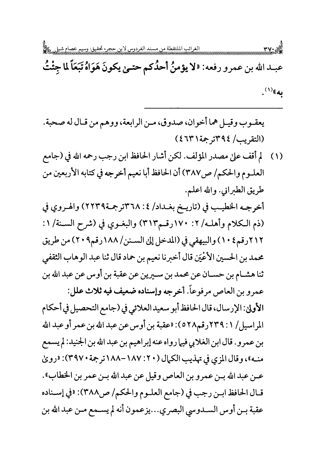عبد الله بن عمرو رفعه: "لا يؤمنُ أحدُكم حتى يكونَ هَوَاهُ تبعًا لما جِئْتُ به" (¬١).