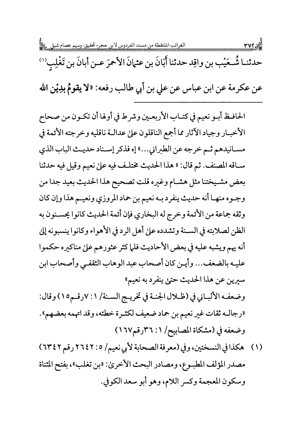 (¬١) هكذا في النسختين، وفي (معرفة الصحابة لأبي نعيم/ ٥: ٢٦٤٢ رقم ٦٣٤٢) مصدر المؤلف المطبوع، ومصادر البحث الأخرى: "بن تغلب"، بفتح المثناة وسكون المعجمة وكسر اللام، وهو أبو سعد الكوفي.